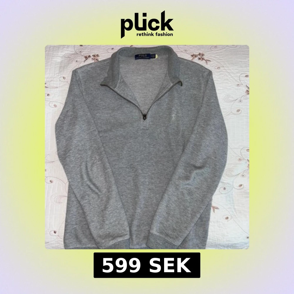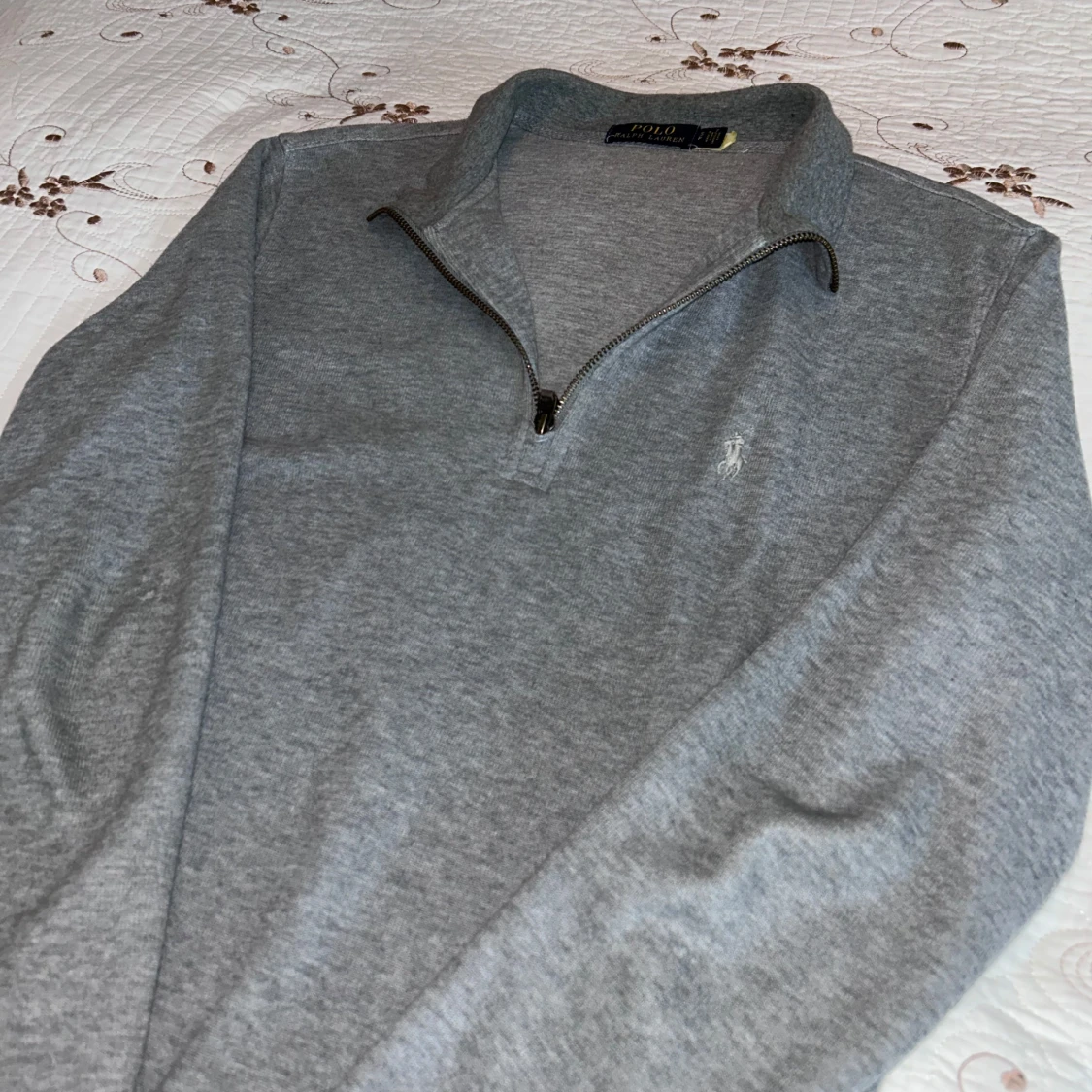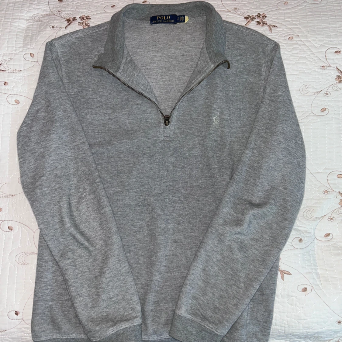 Säljer en stilren grå tröja från Polo Ralph Lauren med dragkedja vid halsen. Tröjan har långa ärmar och en liten broderad logga på bröstet. Perfekt för en avslappnad och snygg look.