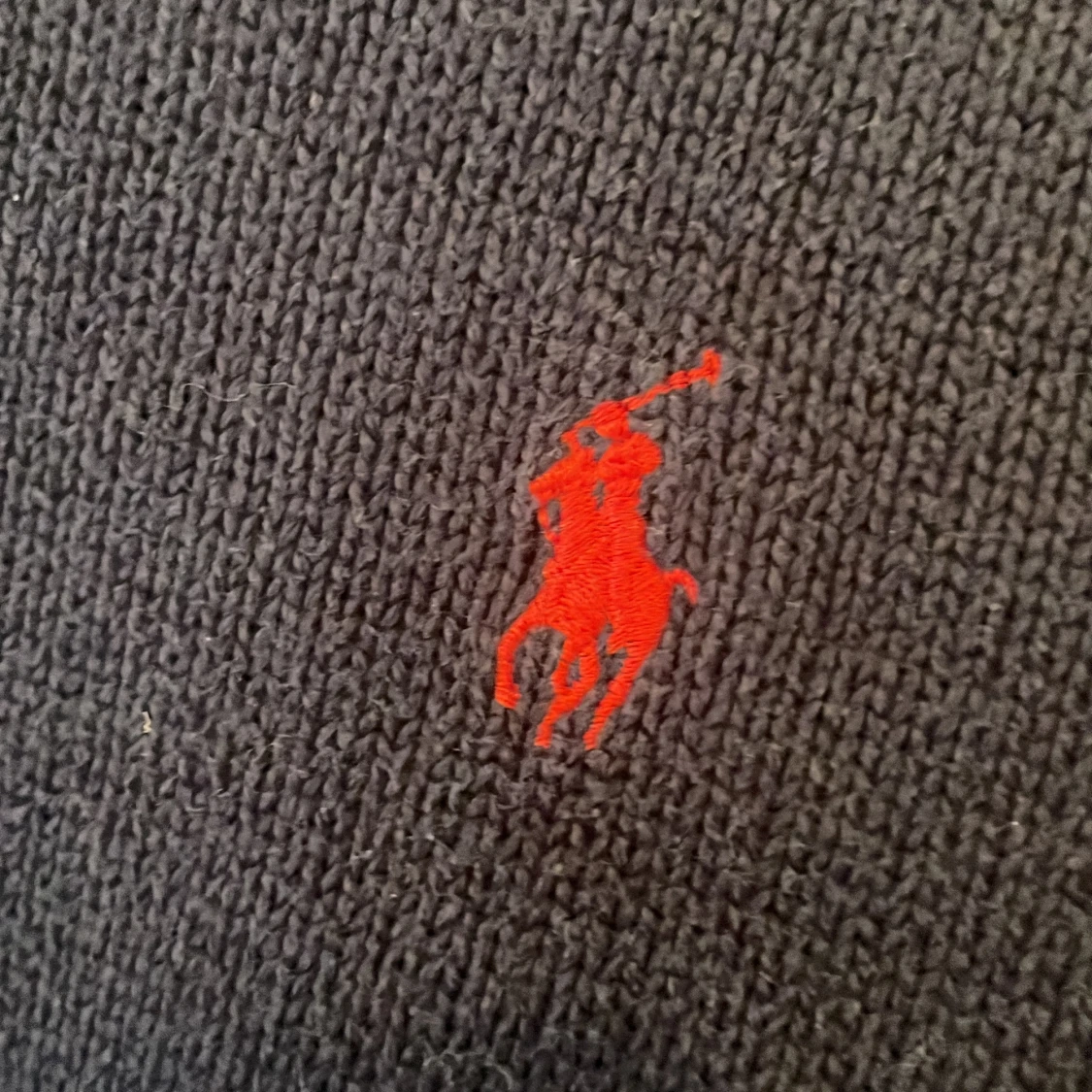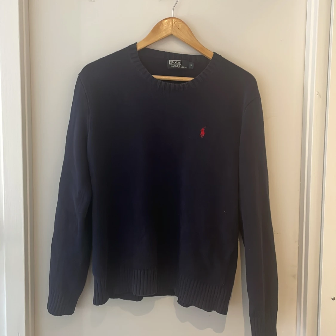 Klassisk mörkblå stickad tröja från Polo Ralph Lauren med rund halsringning och röd broderad logga på bröstet. Tröjan har ribbade muddar vid ärmslut och nederkant, perfekt för en stilren och enkel look.