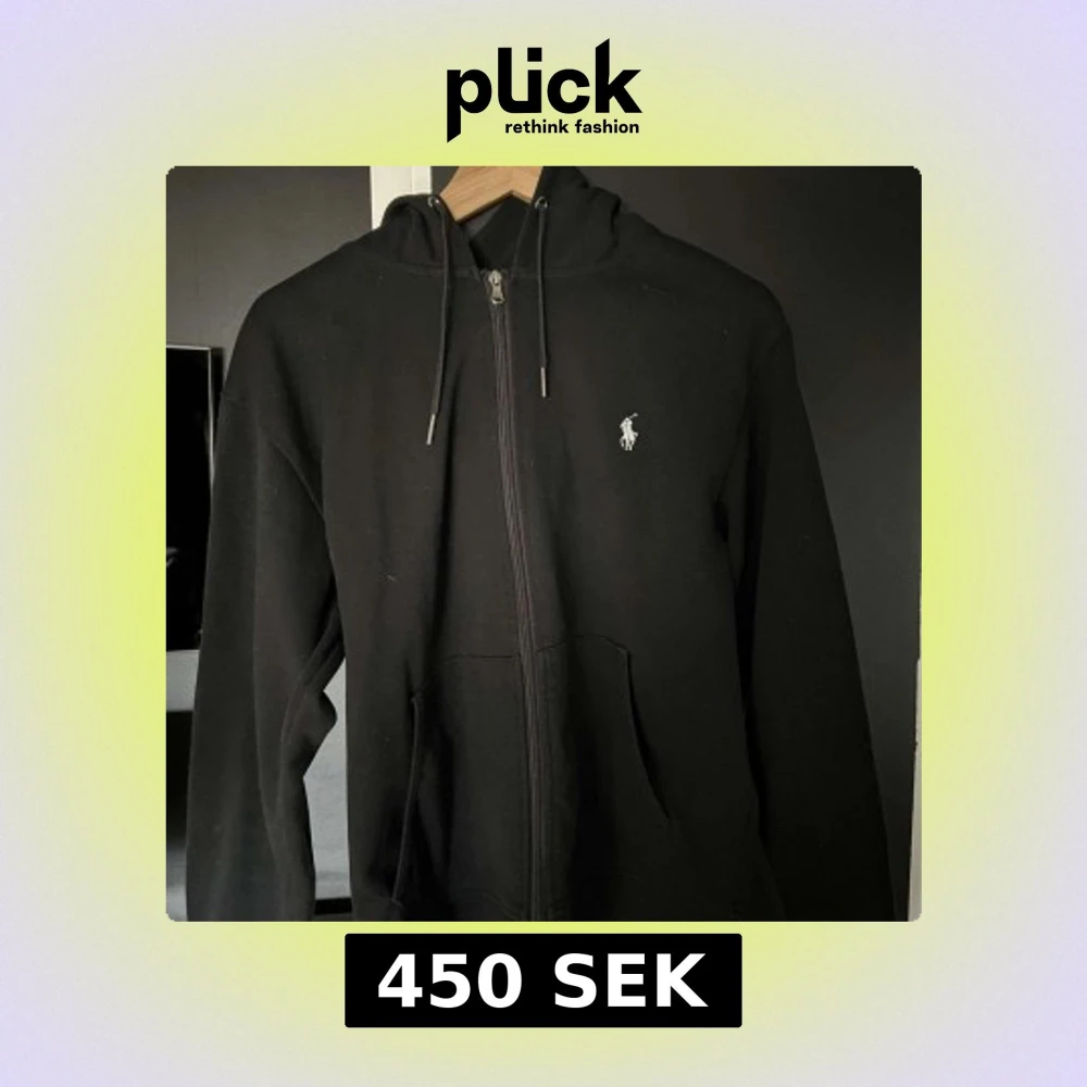 Säljer en klassisk svart hoodie från Ralph Lauren med dragkedja och huva. Den har en liten broderad logga på bröstet och justerbara snören vid huvan. Perfekt för en avslappnad stil.