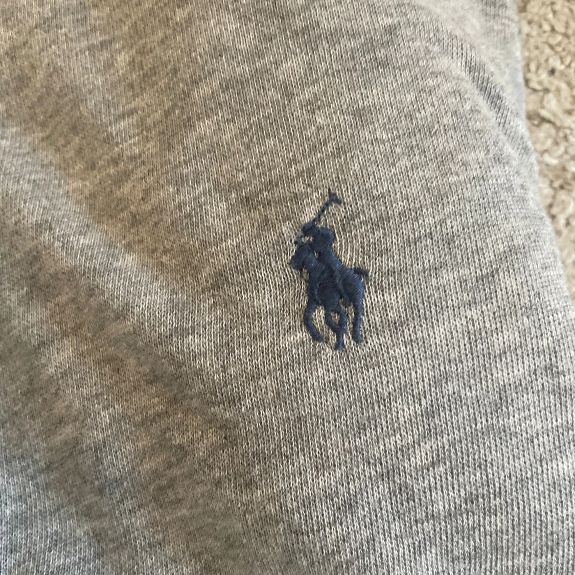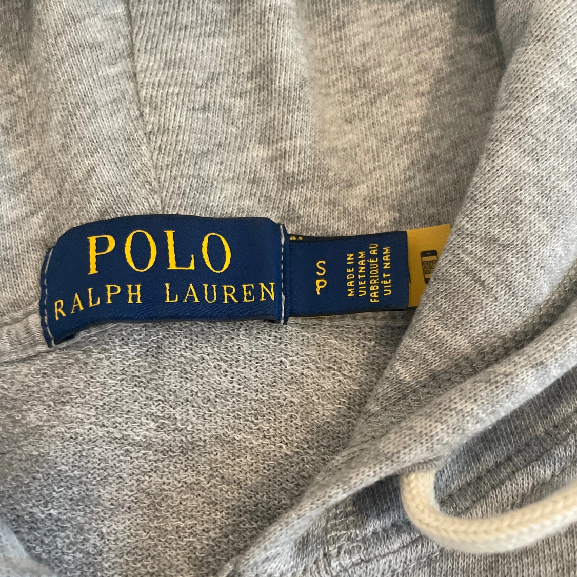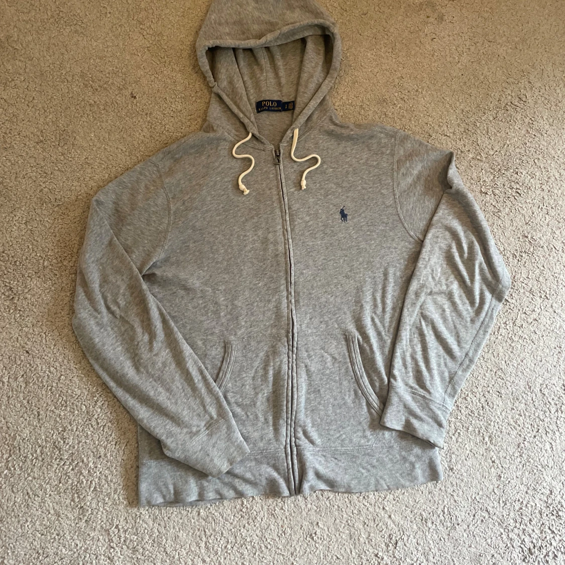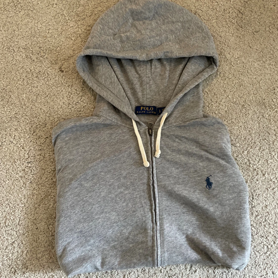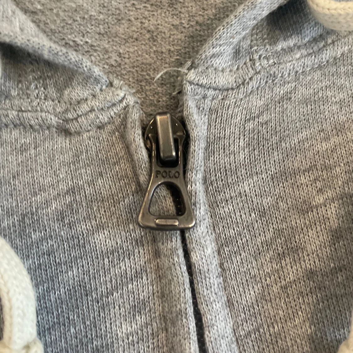 Grå hoodie från Polo Ralph Lauren med dragkedja och huva. Tröjan har vita snören, två fickor framtill och den klassiska blå loggan broderad på bröstet. Tillverkad i mjuk bomullsmix, perfekt för chill dagar eller när du vill vara bekväm. Matrialet är väldigt tunt❤️