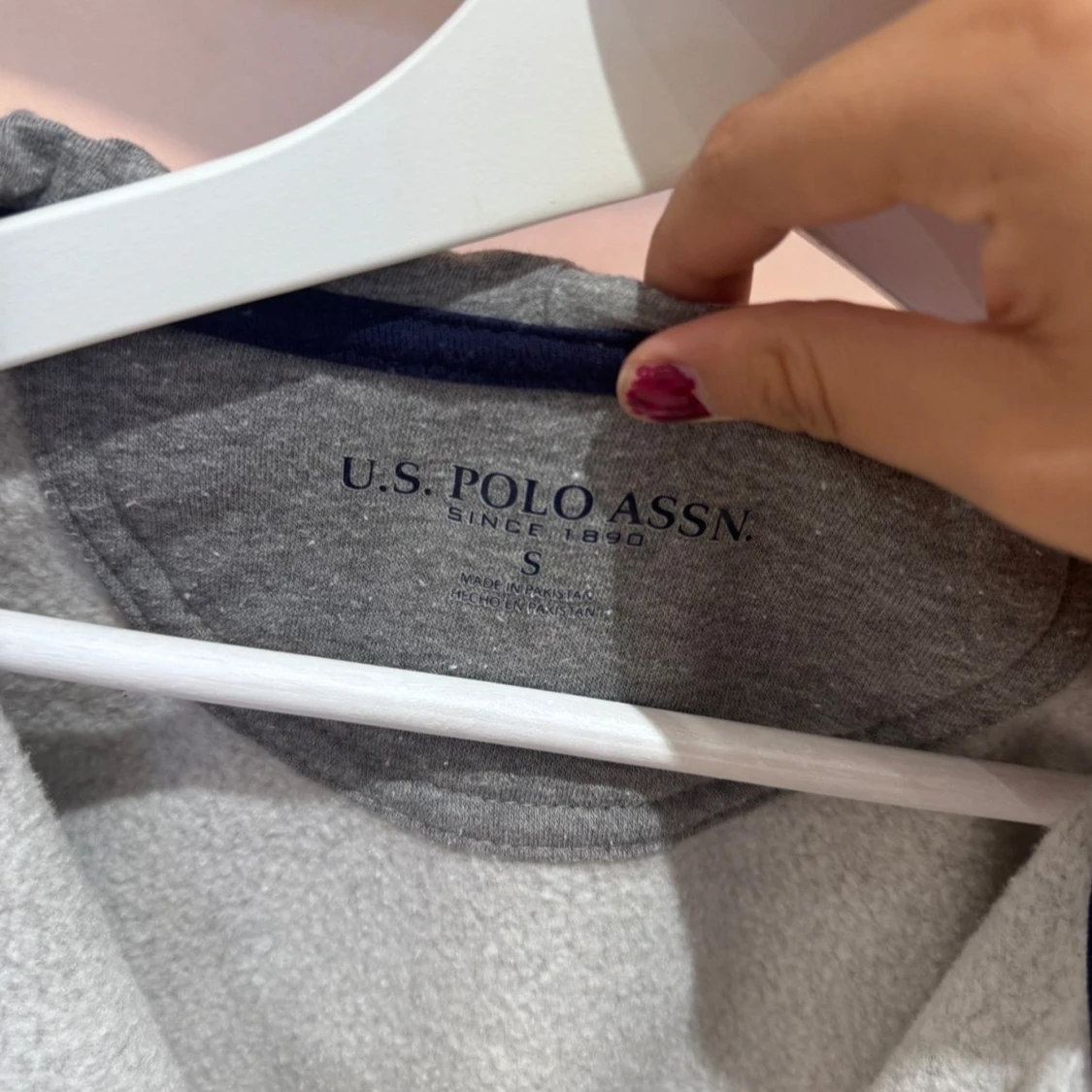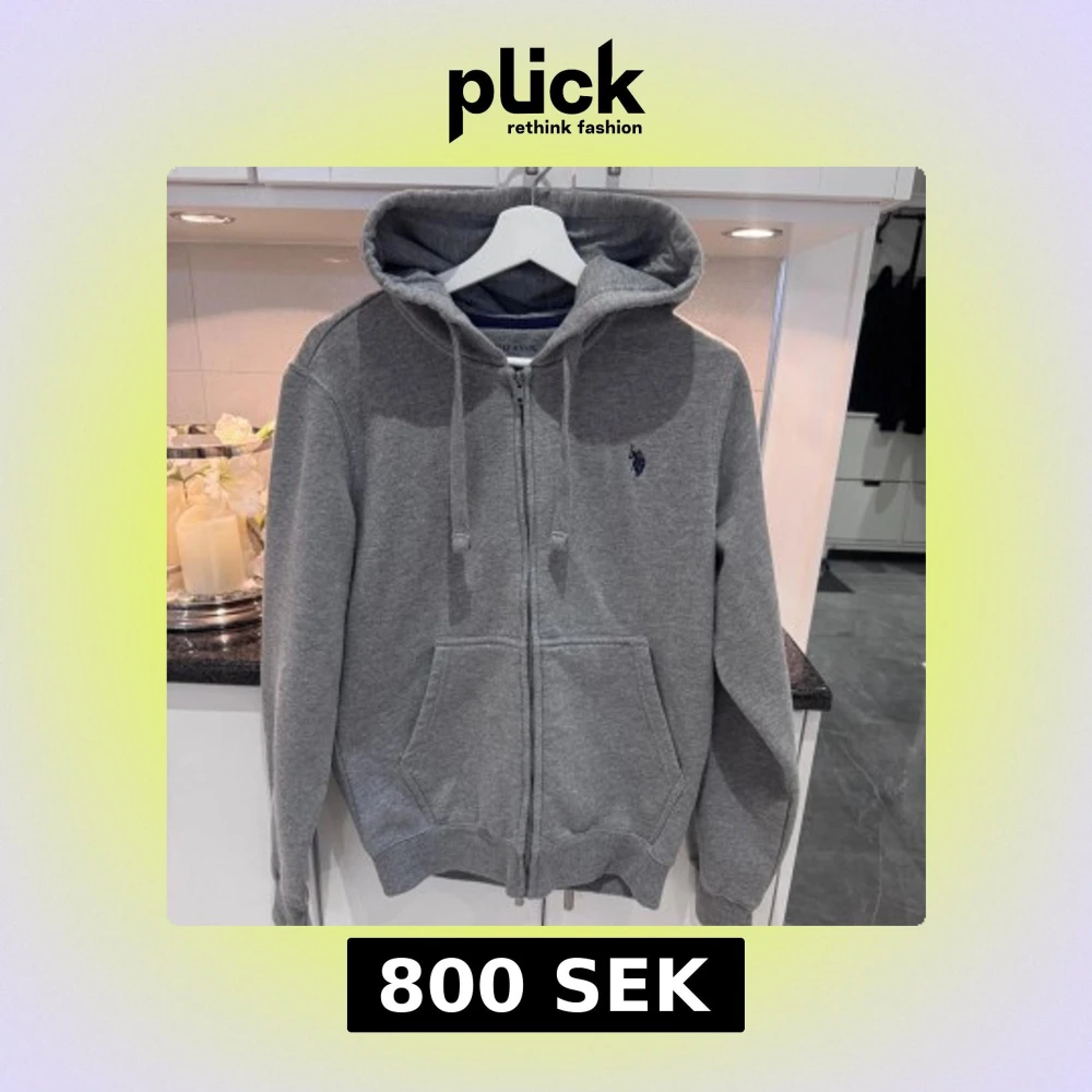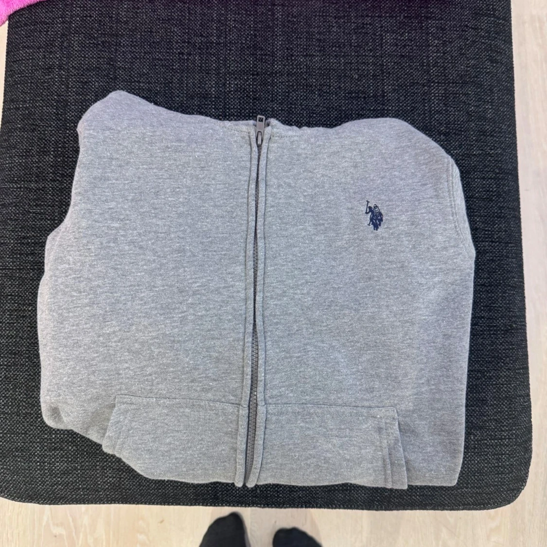 Grå hoodie från U.S. Polo Assn med dragkedja, huva och snörning. Broderad marinblå logga på bröstet och två stora fickor framtill. Skön och stilren, perfekt för chill dagar eller när du vill ha en enkel look. storlek S och helt oanvänd!