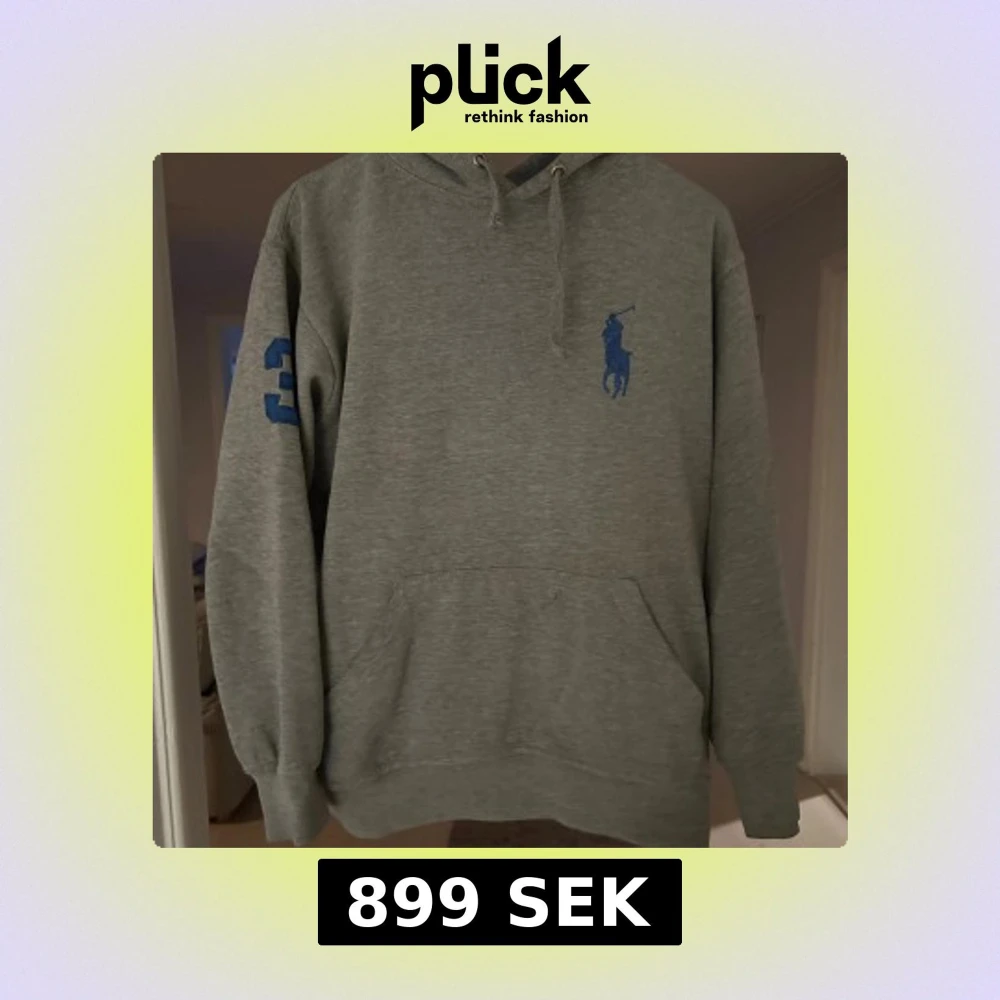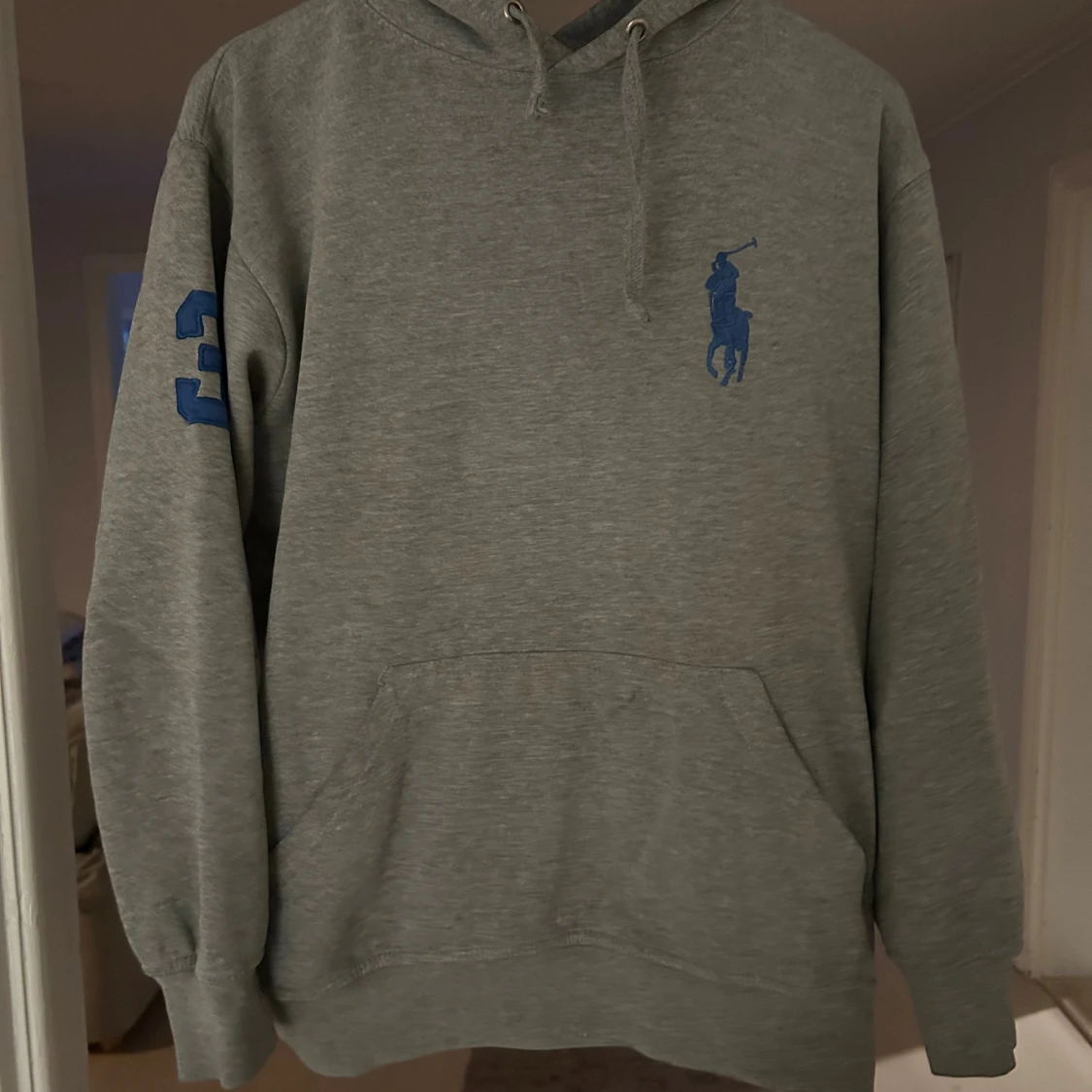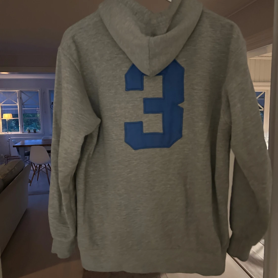 Säljer en stilren grå hoodie från Ralph Lauren med blå logga på bröstet och stort nummer 3 på ärmen och ryggen. Tröjan är bra skick förutom att den är lite sliten på smörerna längst ut annars i bra skick!