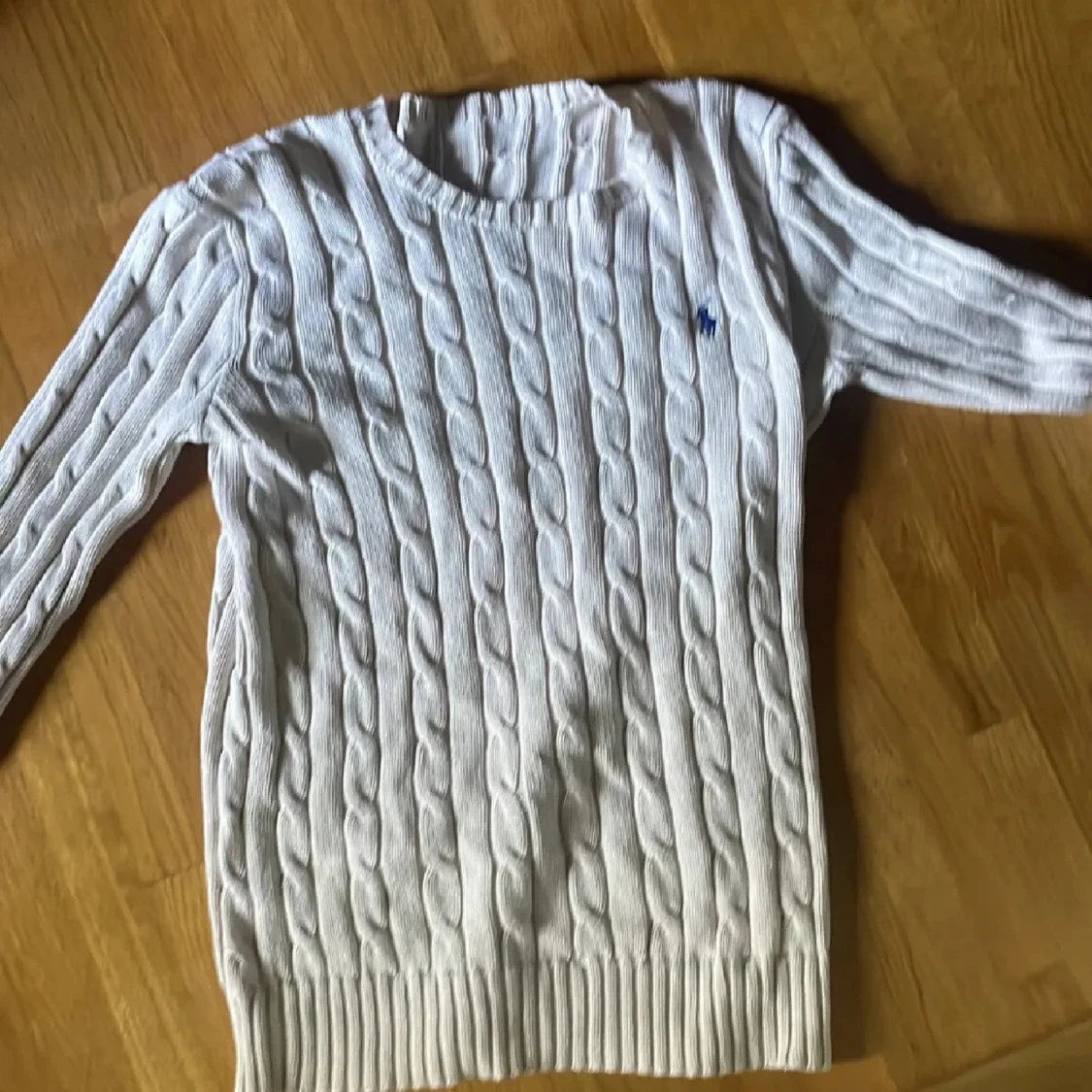 Vit kabelstickad tröja från Ralph Lauren med klassisk blå broderad logga på bröstet. Tröjan har rund halsringning, långa ärmar och ribbade muddar. Perfekt för dig som gillar en clean och tidlös stil.