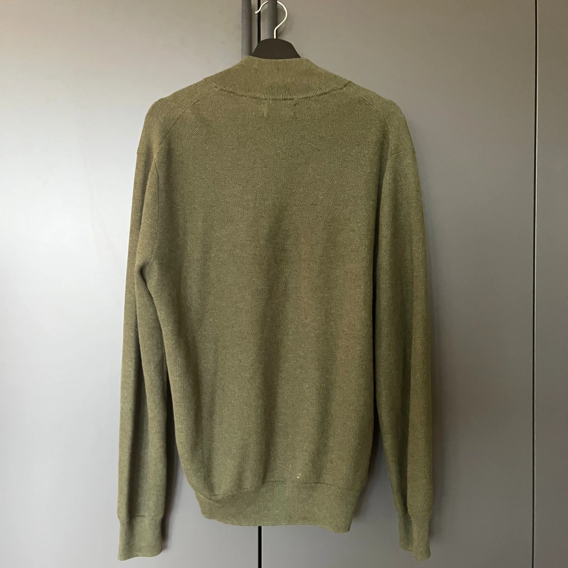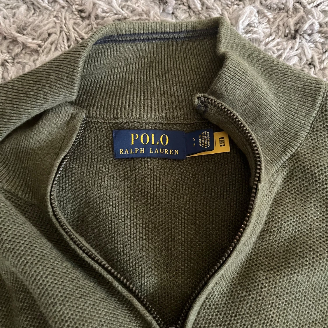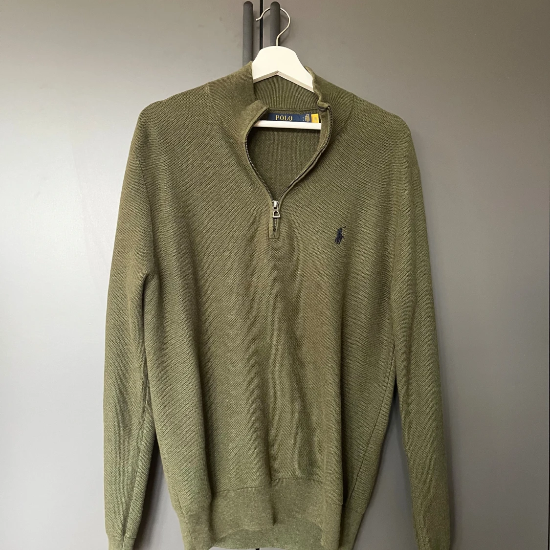 Snygg olivgrön stickad tröja från Polo Ralph Lauren med halv dragkedja och liten broderad logga på bröstet. Tröjan har lång ärm och ribbade muddar, perfekt för lager-på-lager under höst och vinter.