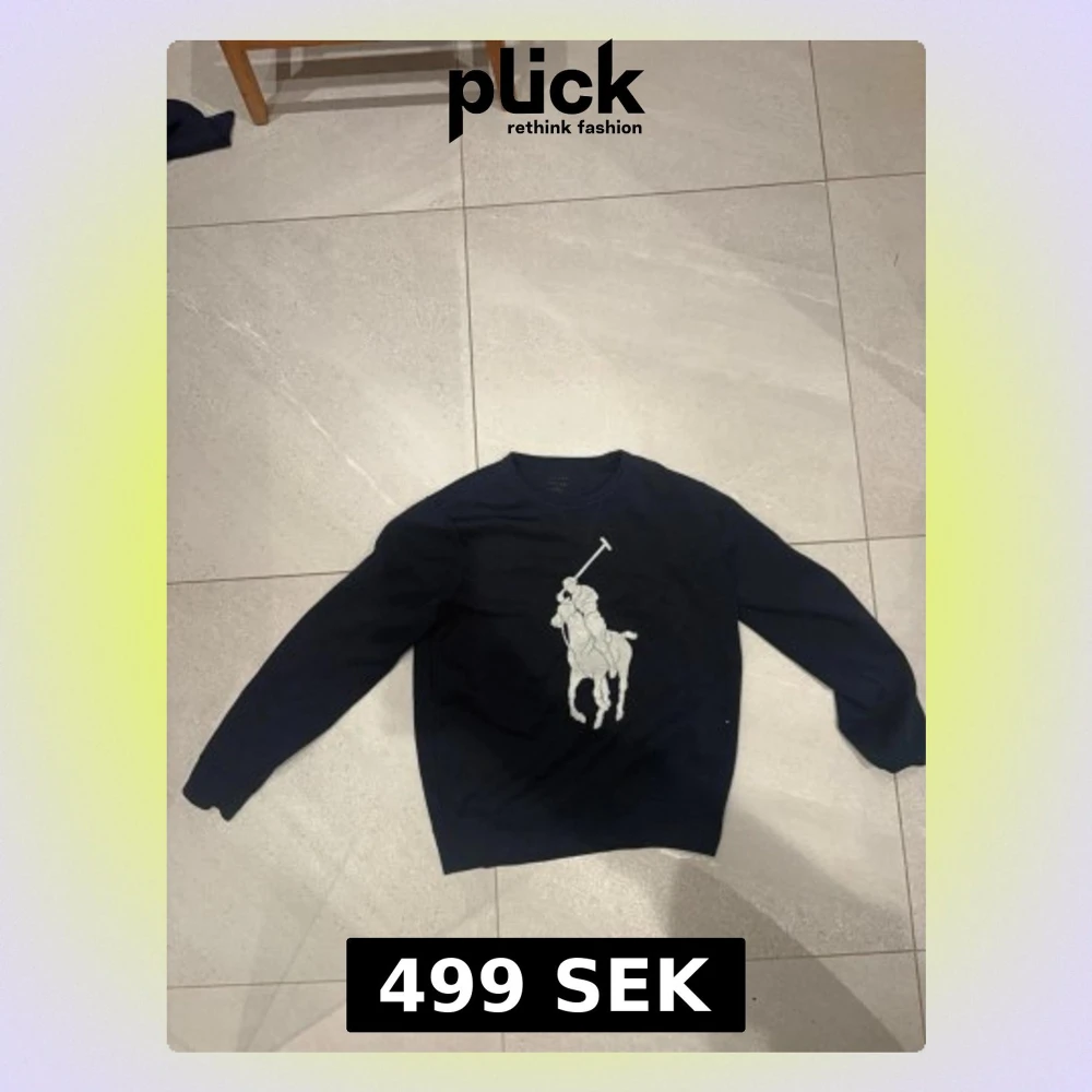 Snygg mörkblå tröja från Ralph Lauren med stort broderat polospelare-motiv i vitt på bröstet. Tröjan har rund hals och långa ärmar, perfekt för dig som gillar klassisk och sportig stil.