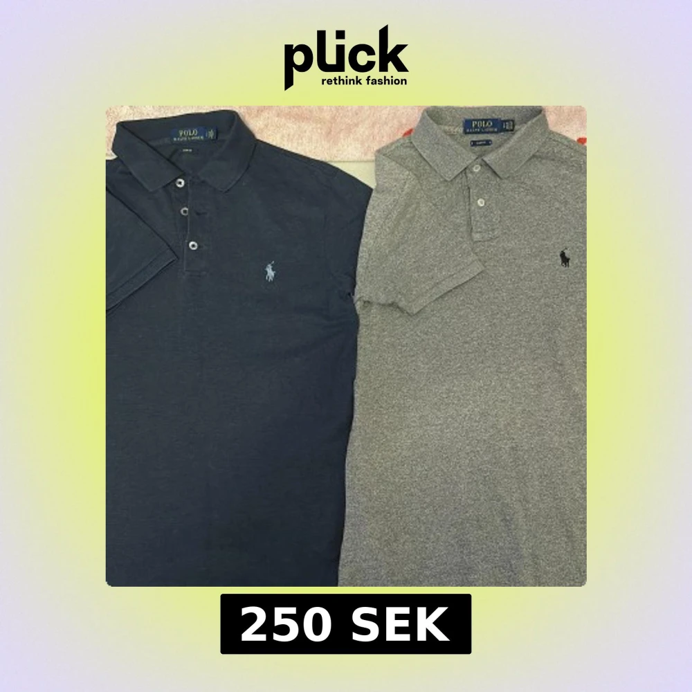 Två klassiska Polo Ralph Lauren pikétröjor i slim fit-modell. En är marinblå med ljusblå broderad logga, den andra är gråmelerad med svart logga. Båda har krage, knappar framtill och korta ärmar. Perfekta för en clean och stilren look.