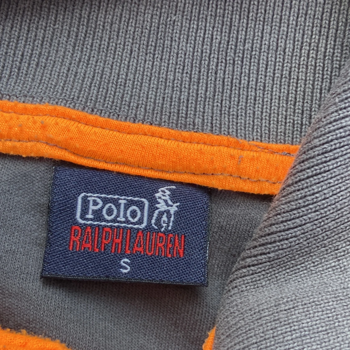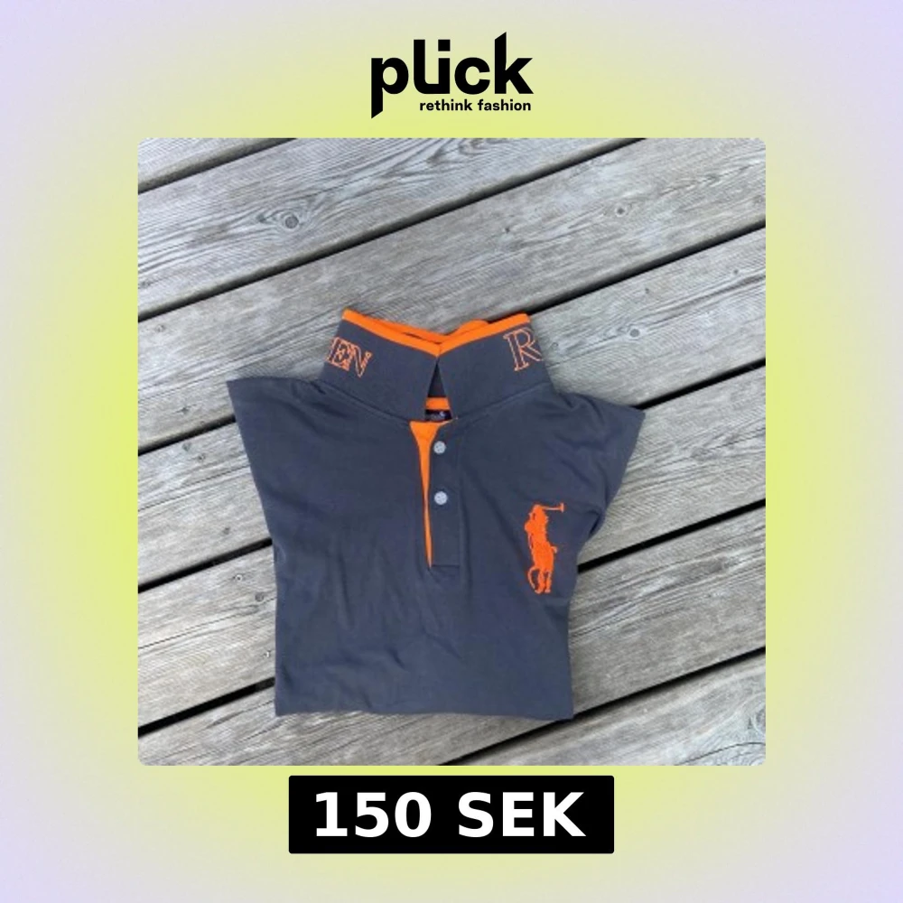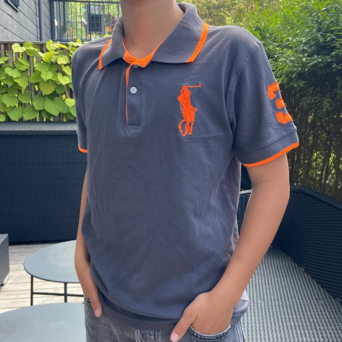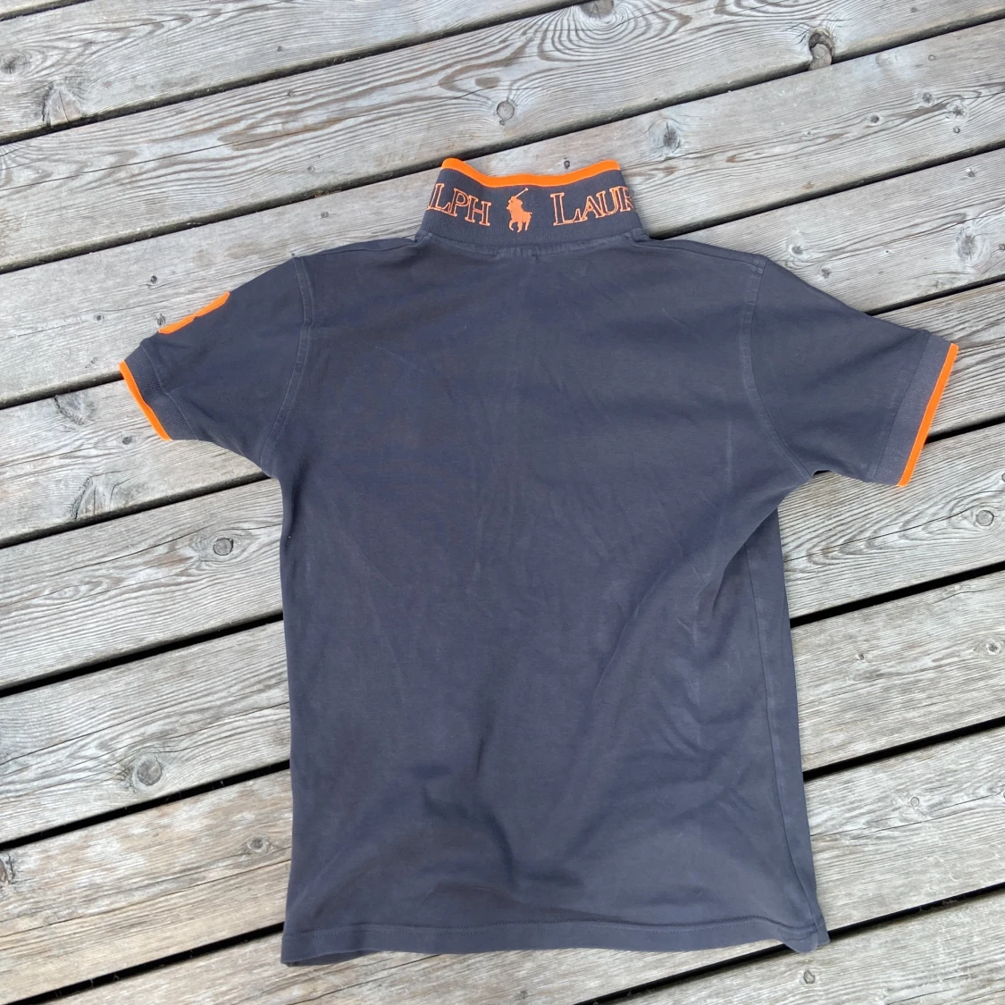 Snygg mörkgrå pikétröja från Ralph Lauren med orange detaljer och stor broderad logga på bröstet. Tröjan har korta ärmar, klassisk krage och orange kantband samt nummerdetalj på ärmen. Perfekt för en sportig och stilren look. Priset är ej hugget i sten och kan ändras.