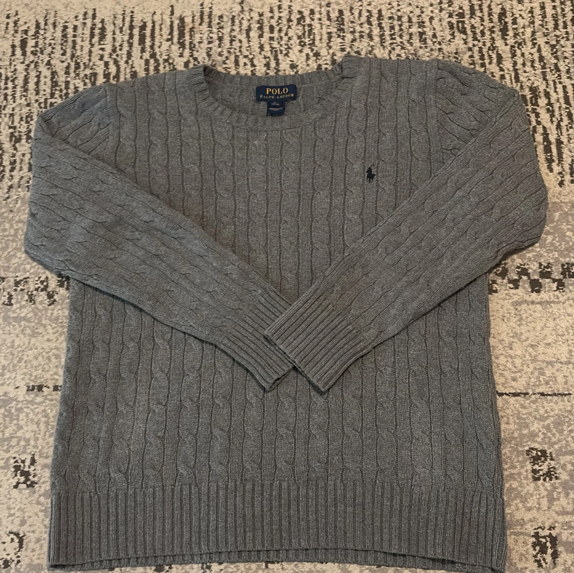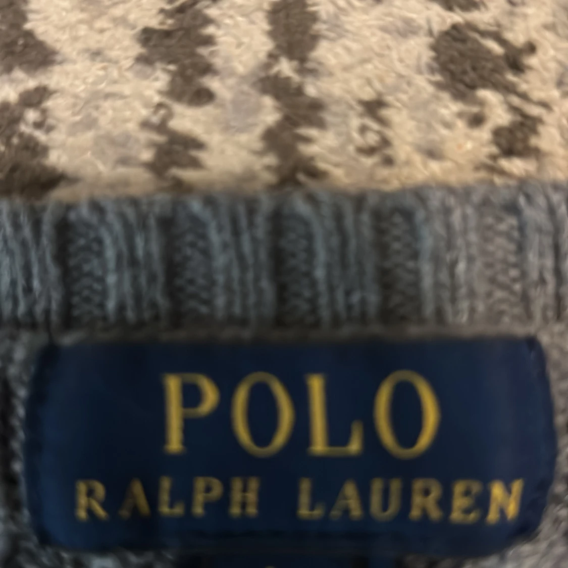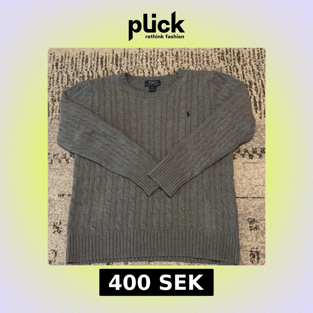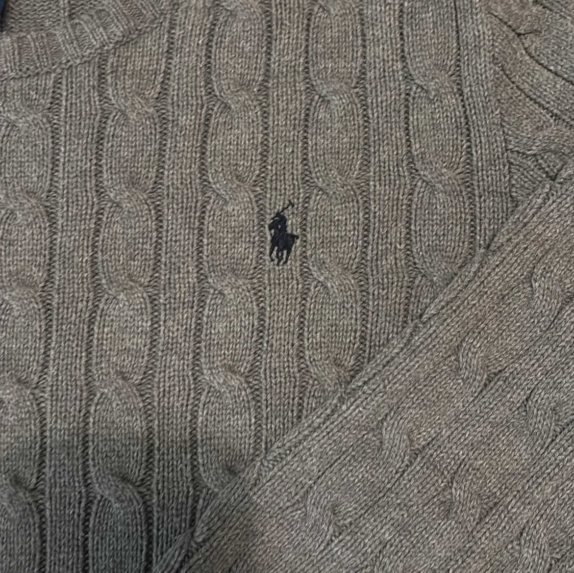 Säljer en snygg grå kabelstickad tröja från Polo Ralph Lauren med klassisk rund hals och långärmad passform. Tröjan har det ikoniska Polo-logot broderat på bröstet och är gjord i mjuk stickad bomull. Perfekt för dig som gillar stilrena och tidlösa plagg.