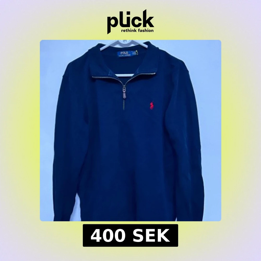 Säljer en klassisk mörkblå långärmad tröja från Polo Ralph Lauren med halv dragkedja och röd broderad logga på bröstet. Perfekt för en stilren och avslappnad look. Tröjan har en normal passform och är tillverkad i mjukt material.