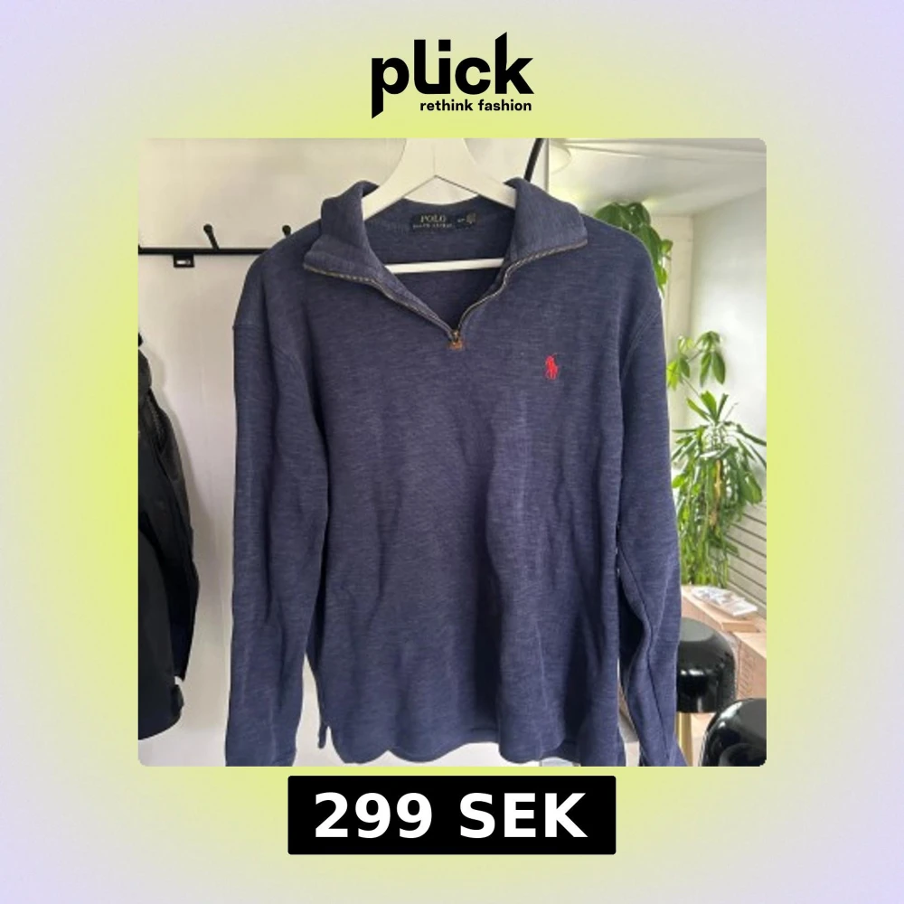 Mörkblå långärmad tröja från Polo Ralph Lauren med half zip och klassisk krage. Tröjan har röd broderad logga på bröstet. Tröjan har slitage på armbågarna (Se sista två bilderna), men är annars i bra skick.