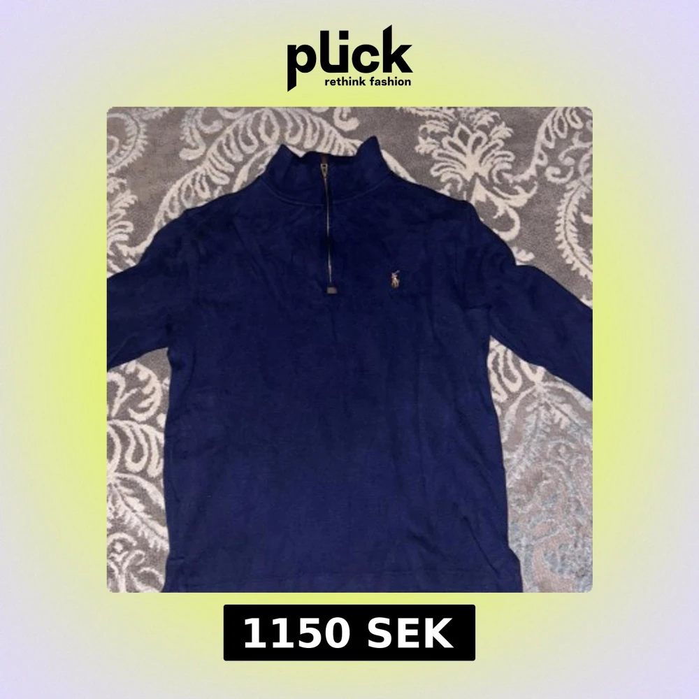 Säljer en snygg blå tröja från Ralph Lauren med dragkedja och broderad logga på bröstet. Perfekt för en stilren look.