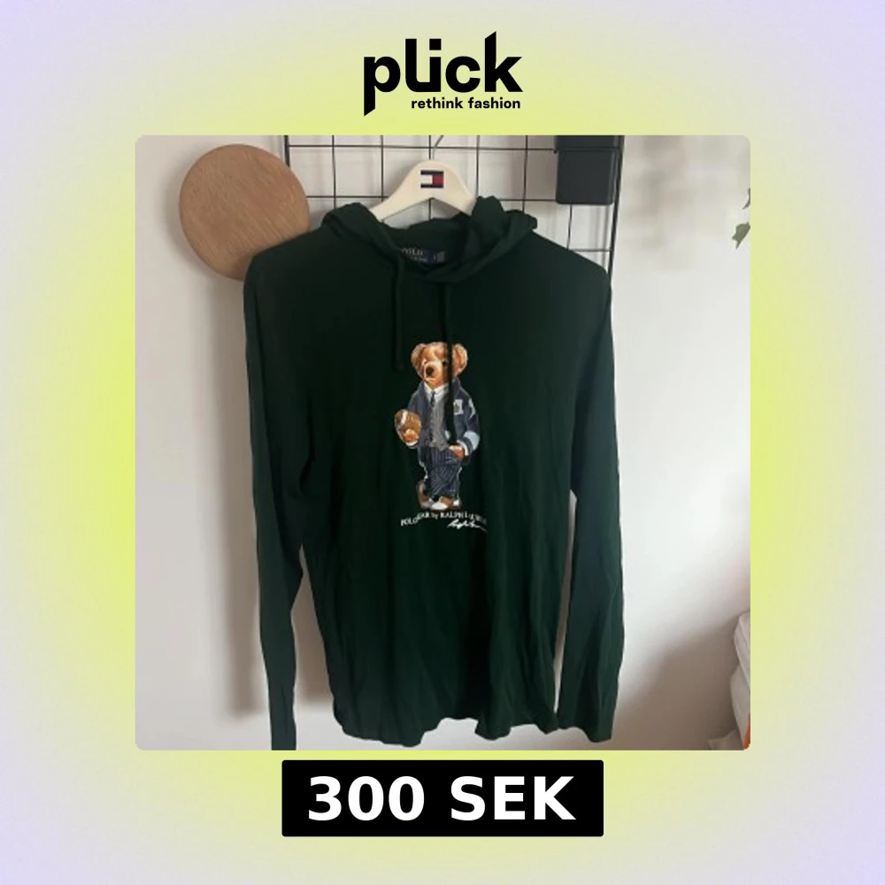 Mörkgrön hoodie från Polo Ralph Lauren med ikoniska Polo Bear-trycket på bröstet. Långärmad modell med huva och snörning. Tillverkad i mjuk bomull. Skickar innom 24-48h om tid finns. Du kan kontakta mig för prisförslag! Finns ett mini hål vid lappen men syns knappt💕