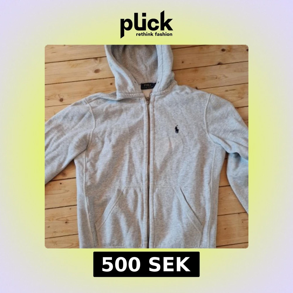 Säljer en stilren grå hoodie från Ralph Lauren med dragkedja och klassisk logga på bröstet. Perfekt för en avslappnad look. Den har en bekväm passform och praktiska fickor framtill.