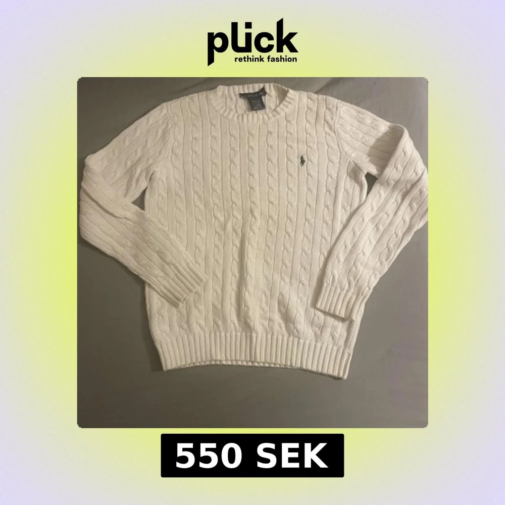 Säljer en klassisk vit stickad tröja från Ralph Lauren med kabelstickat mönster. Tröjan har långa ärmar och en rund halsringning. Perfekt för kyligare dagar.