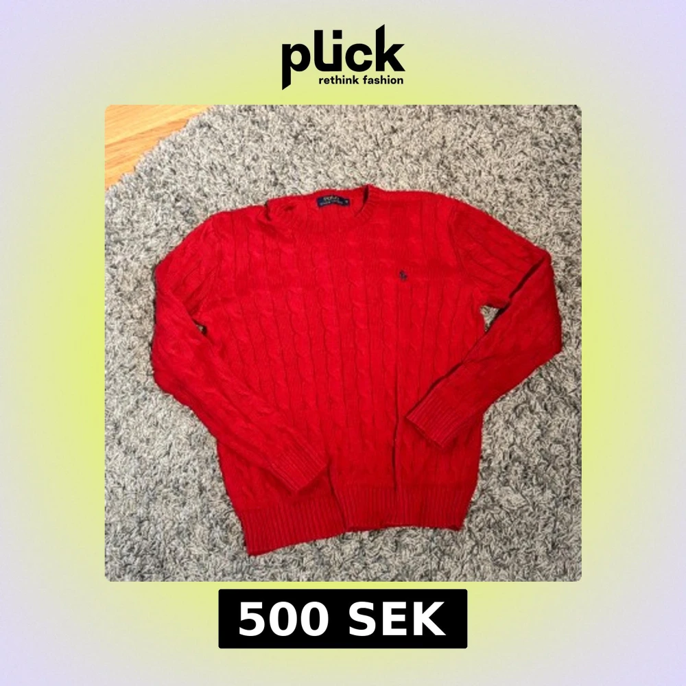 Säljer en snygg röd stickad tröja från Polo Ralph Lauren med kabelstickat mönster. Tröjan har långa ärmar och en broderad logotyp på bröstet. Perfekt för kyligare dagar!