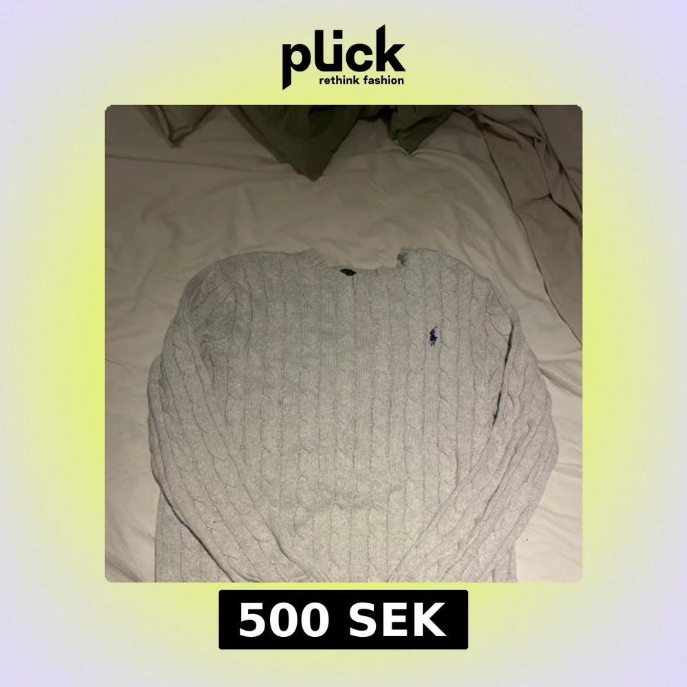 Säljer en stilren grå stickad tröja från Polo Ralph Lauren. Tröjan har ett klassiskt flätmönster och en liten broderad logga på bröstet. Perfekt för kyligare dagar med sin mjuka och bekväma passform.