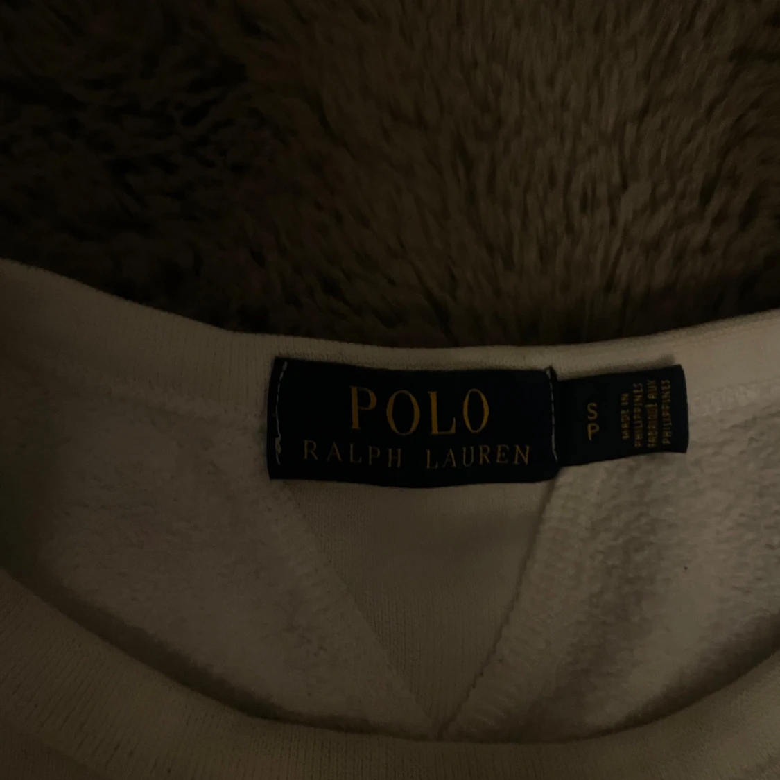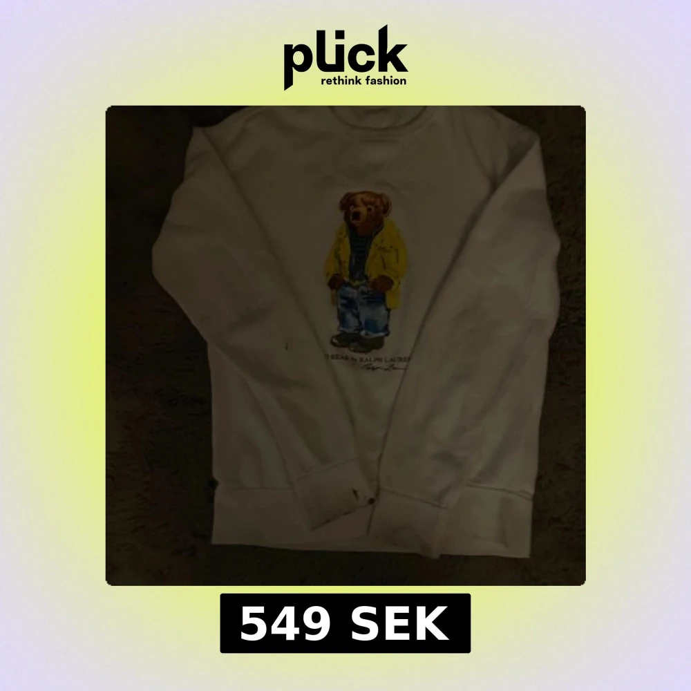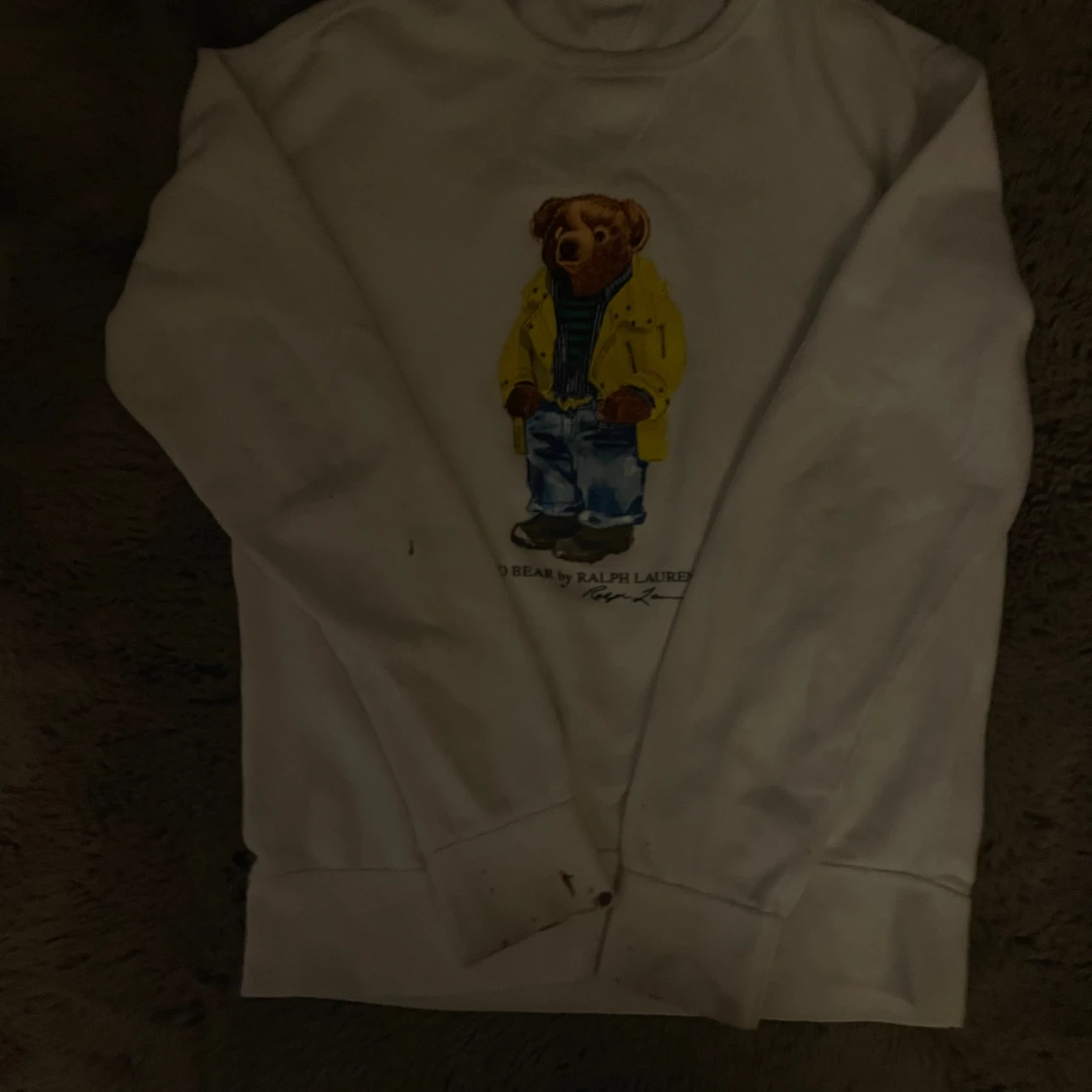 Vit sweatshirt från Polo Ralph Lauren med ikonisk björn på bröstet. Tröjan har rund halsringning och långa ärmar. Björnen har gul jacka och jeans, vilket ger en cool och lekfull vibe. Perfekt för dig som gillar streetstyle och klassiska märken.