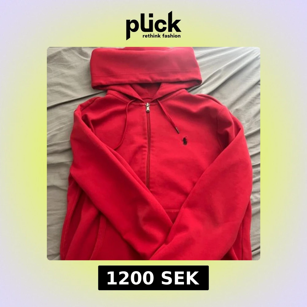 Säljer en snygg röd hoodie från Ralph Lauren med dragkedja och klassisk logga på bröstet. Perfekt för en avslappnad stil. Den har en bekväm passform och en praktisk huva med snörning.