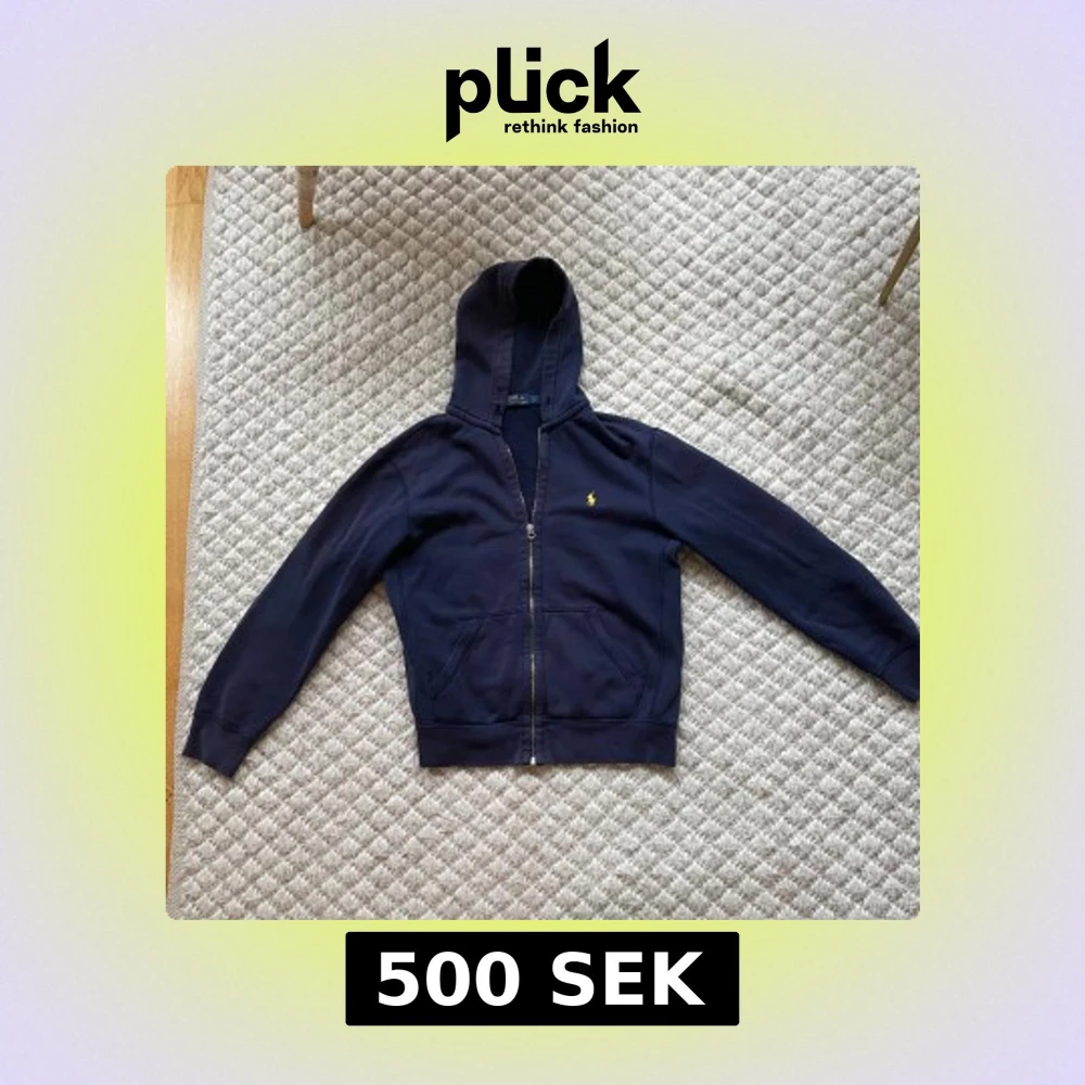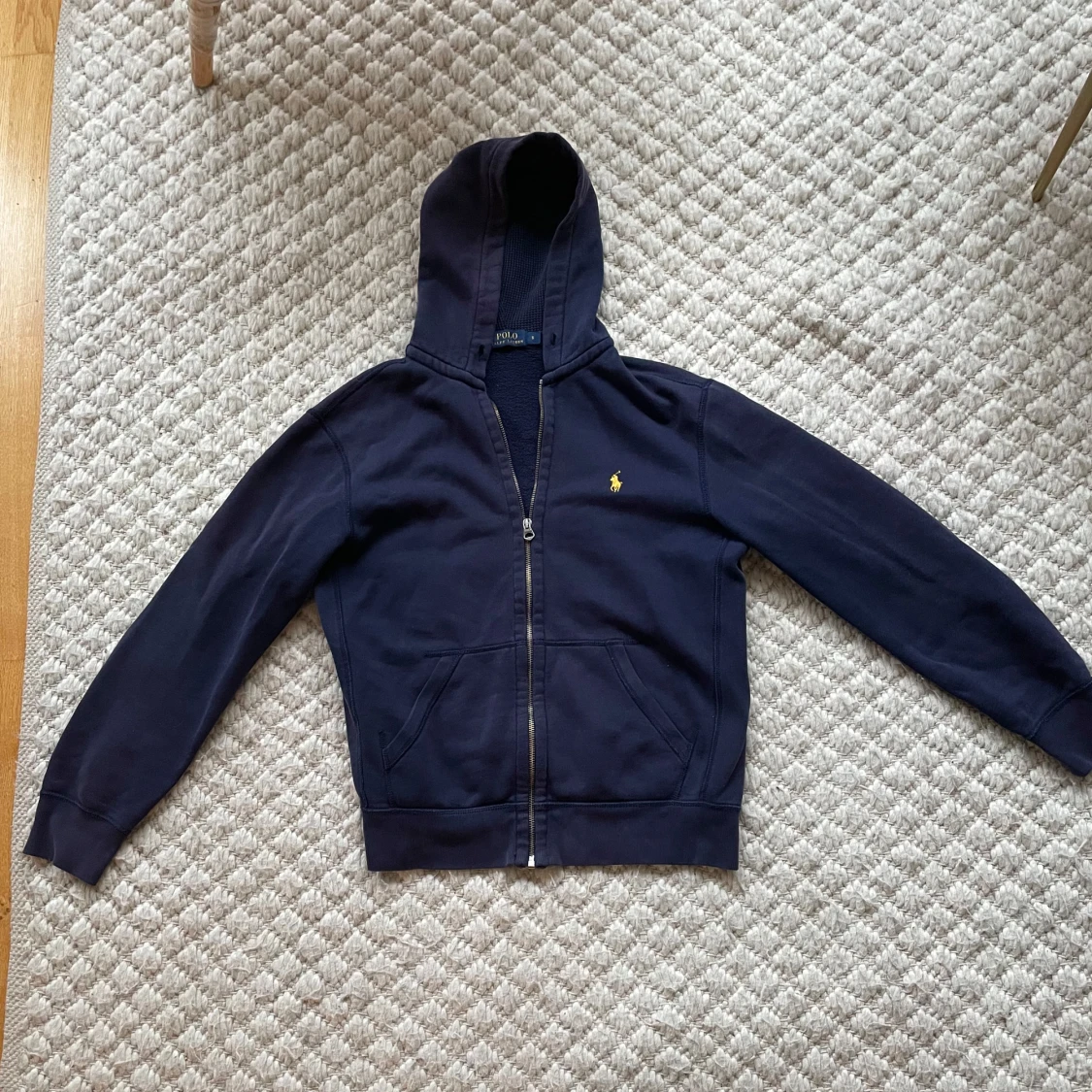 Säljer en snygg mörkblå hoodie från Ralph Lauren med dragkedja och det klassiska logotypbroderiet på bröstet. Perfekt för en avslappnad stil. Den har långa ärmar och en bekväm huva.