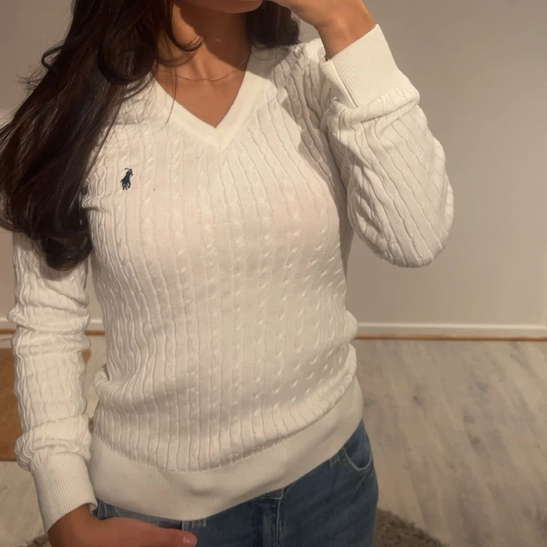 Vit kabelstickad tröja från Ralph Lauren med v-ringning och lång ärm. Klassisk design med broderad marinblå logga på bröstet. Tröjan är i mjuk bomull och har ribbade muddar vid ärmslut och nederkant. Perfekt till jeans för en clean look.