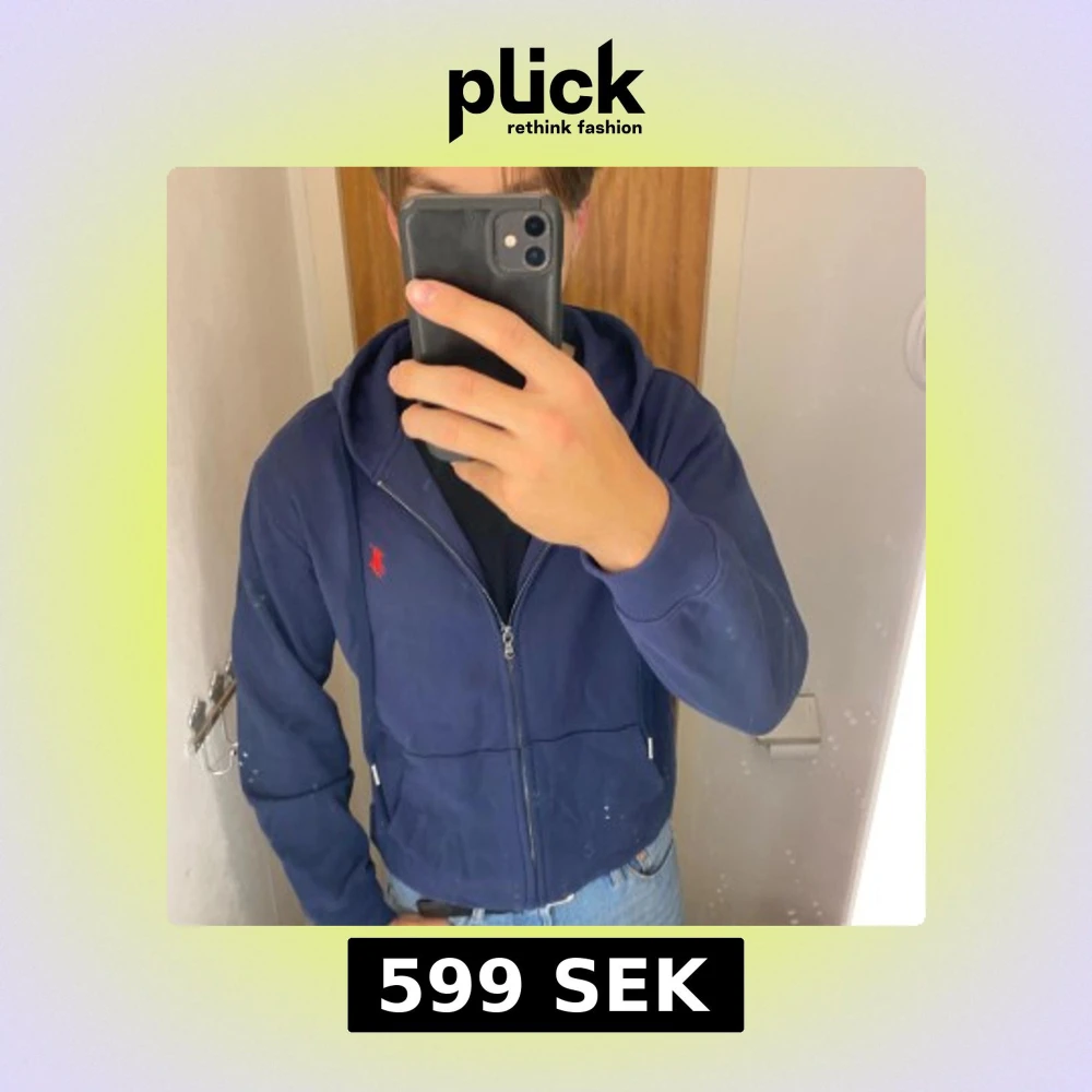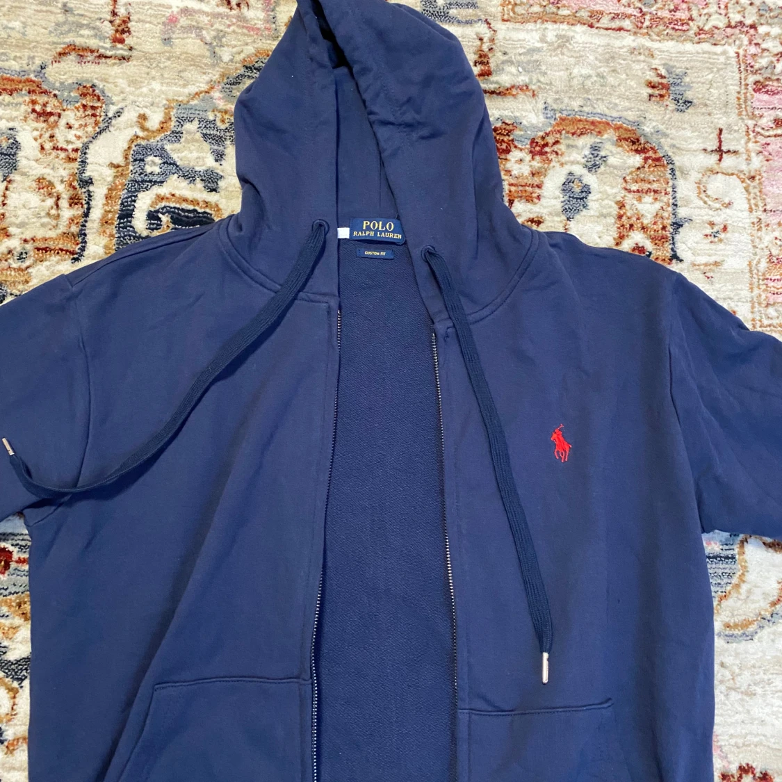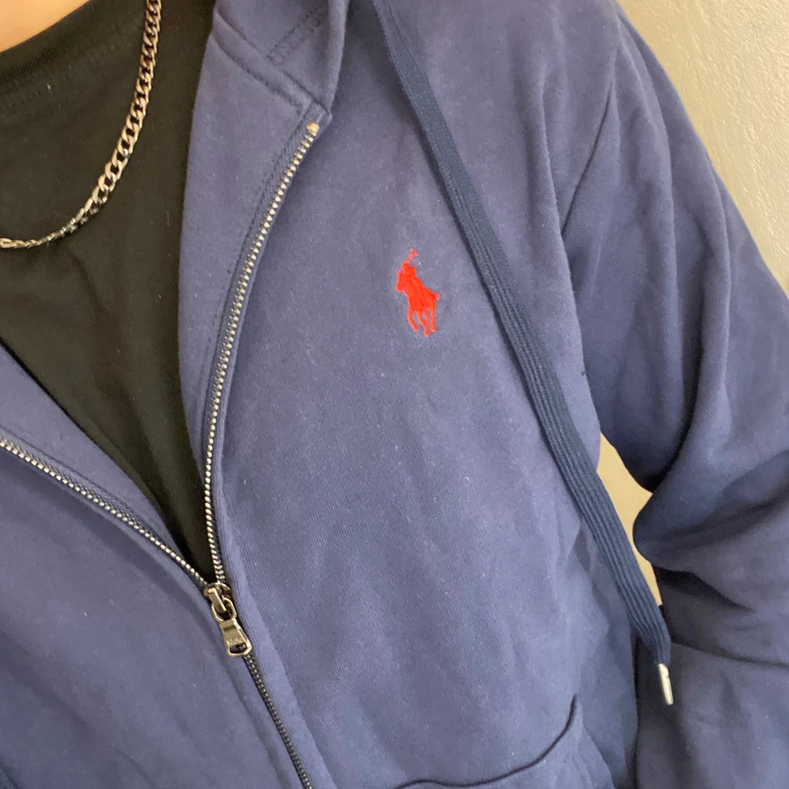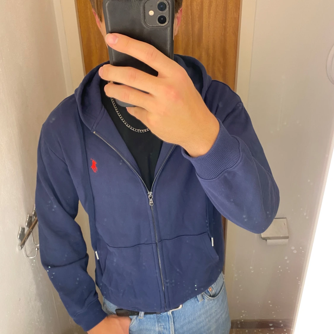 Säljer en snygg blå huvtröja från Polo Ralph Lauren med dragkedja och röd broderad logga på bröstet. Säljer då den var lite för liten för mig. Perfekt för en casual look. Tröjan har en justerbar huva med snören och ribbade muddar vid ärmslut.