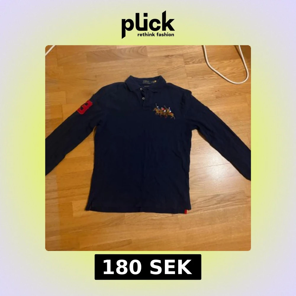 Säljer en mörkblå långärmad pikétröja från Ralph Lauren med broderat polospel-motiv på bröstet och röd siffra 3 på ärmen. Tröjan har klassisk krage, knappar vid halsen och är i bomull med slim fit-passform.