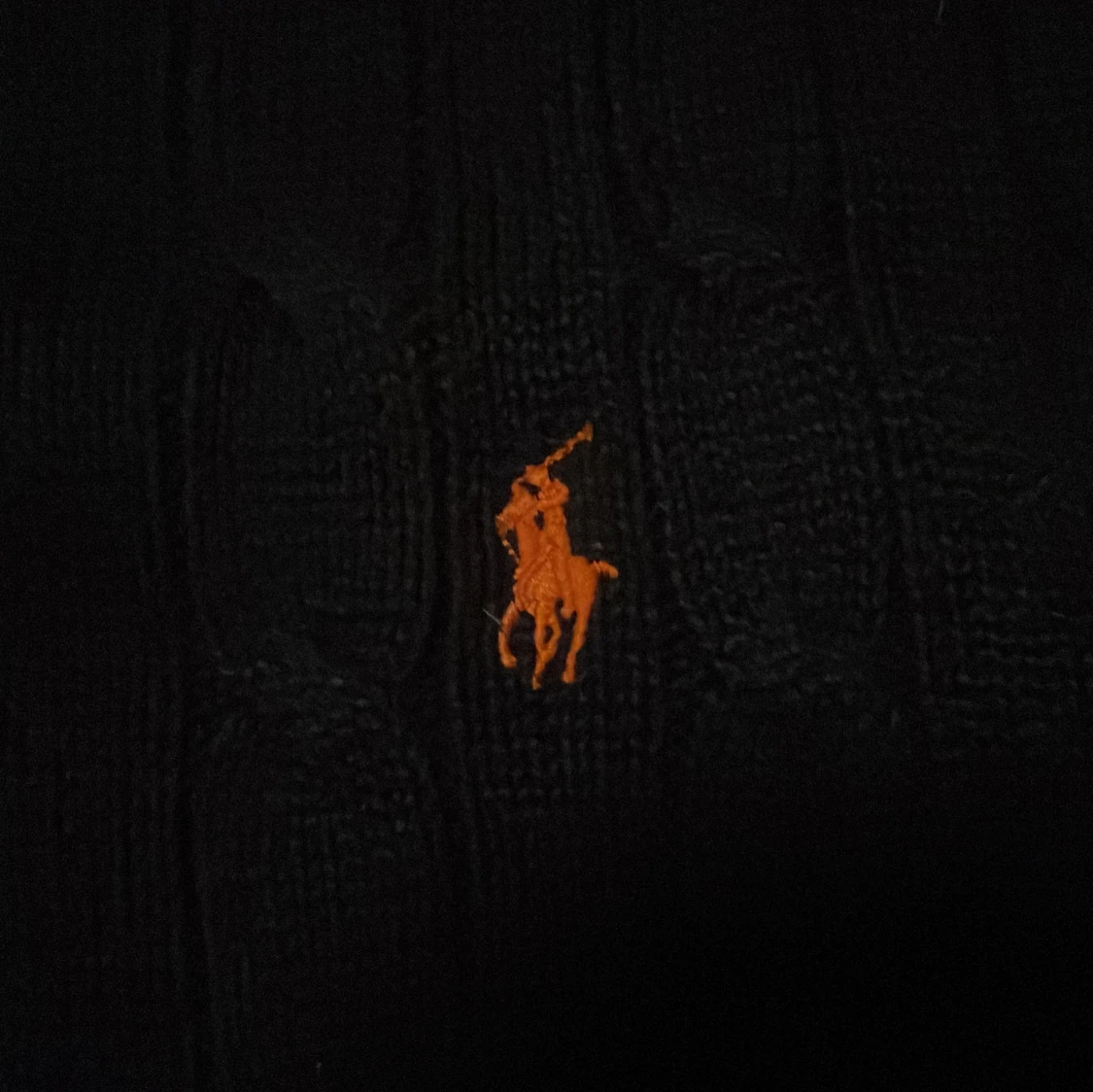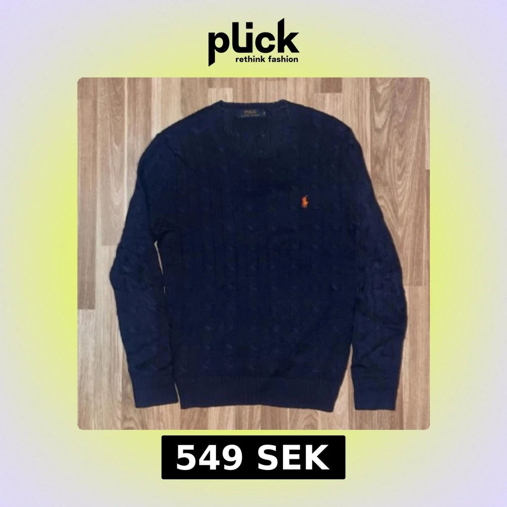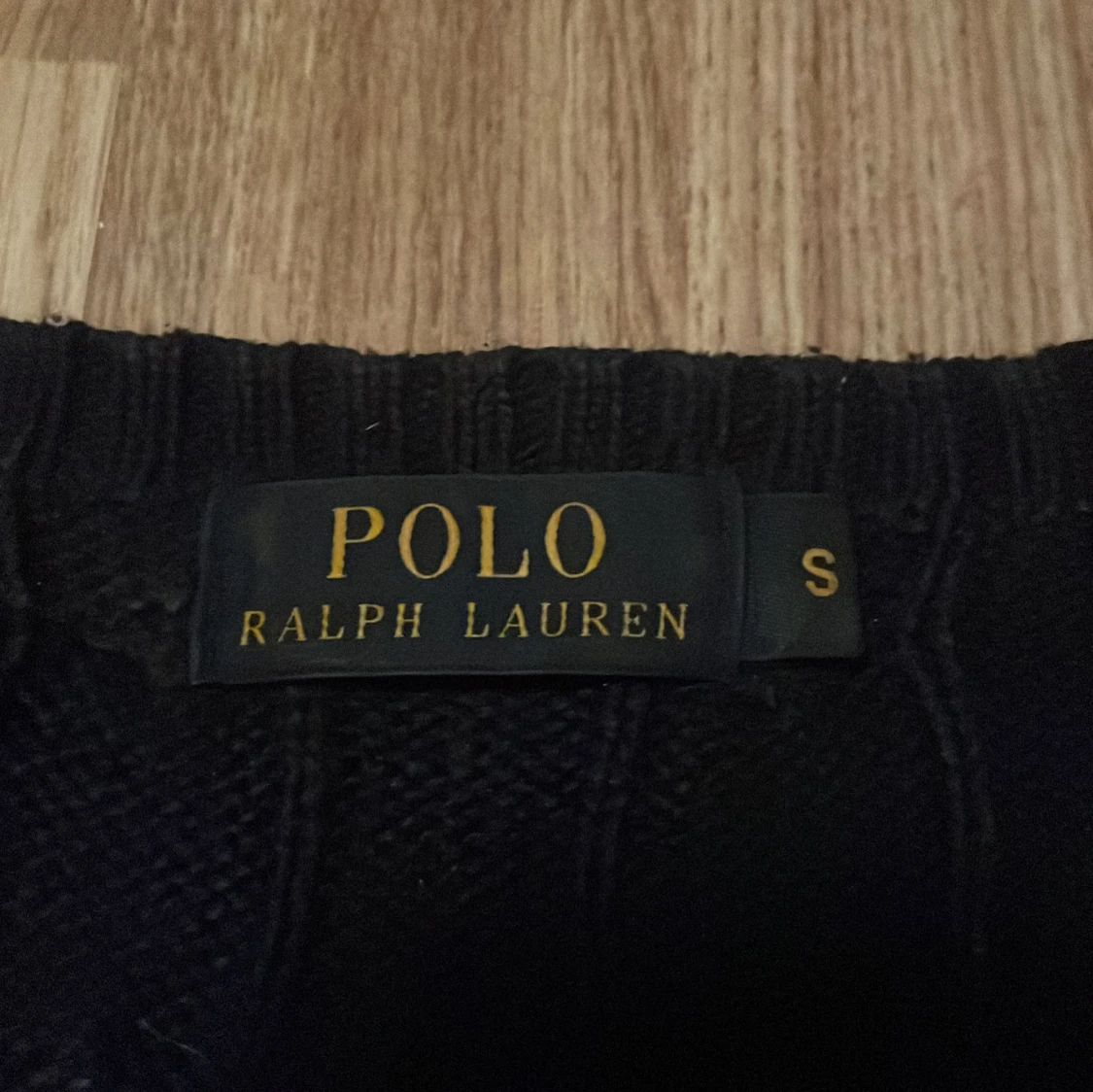 Säljer en snygg mörkblå stickad tröja från Polo Ralph Lauren med det klassiska broderade logotypen i röd på bröstet. Tröjan har långa ärmar och en ribbad struktur som ger en stilren look. Perfekt för kyligare dagar.
