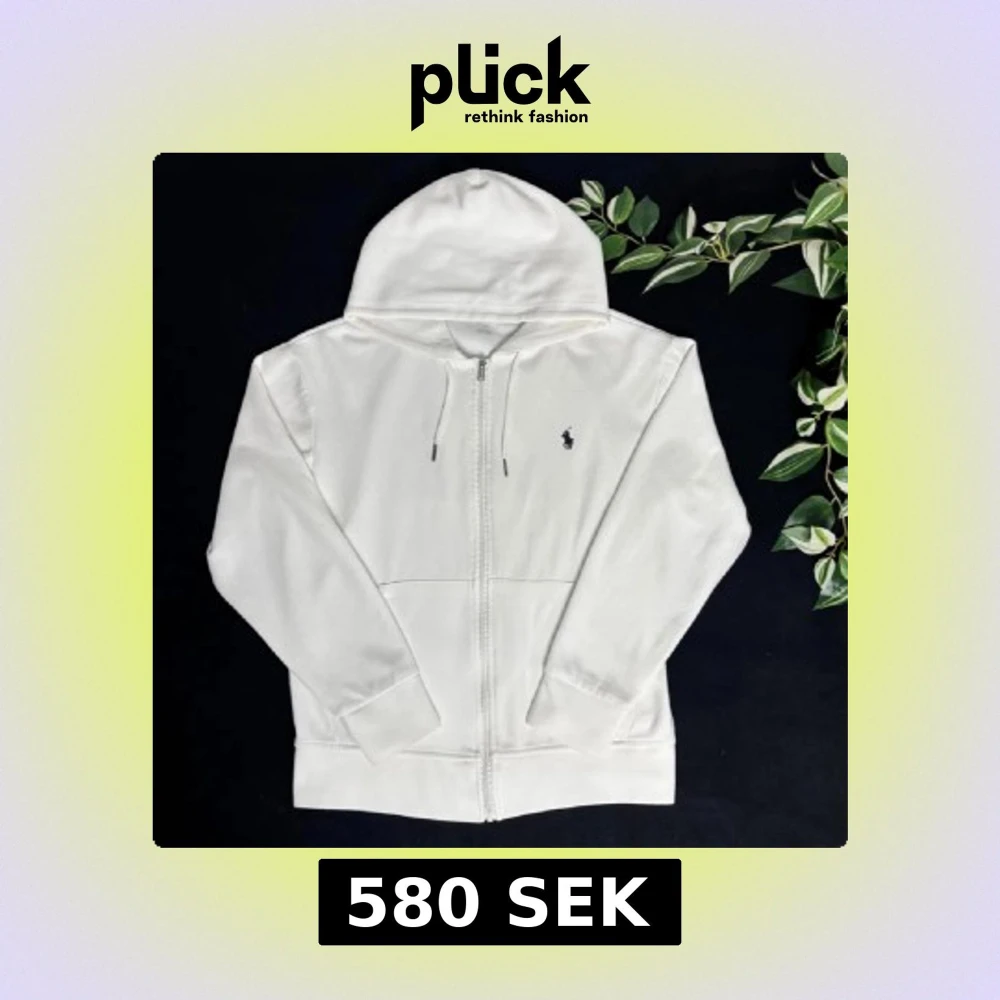 Säljer en stilren vit hoodie från Ralph Lauren med dragkedja och det klassiska logotypen på bröstet. Tröjan har långa ärmar och en praktisk huva. Perfekt för en avslappnad look.