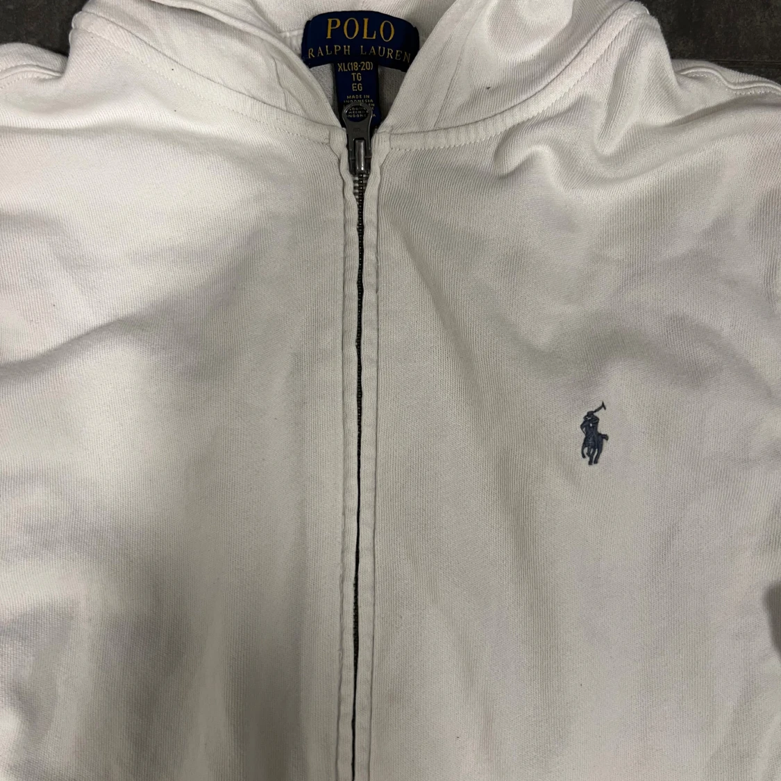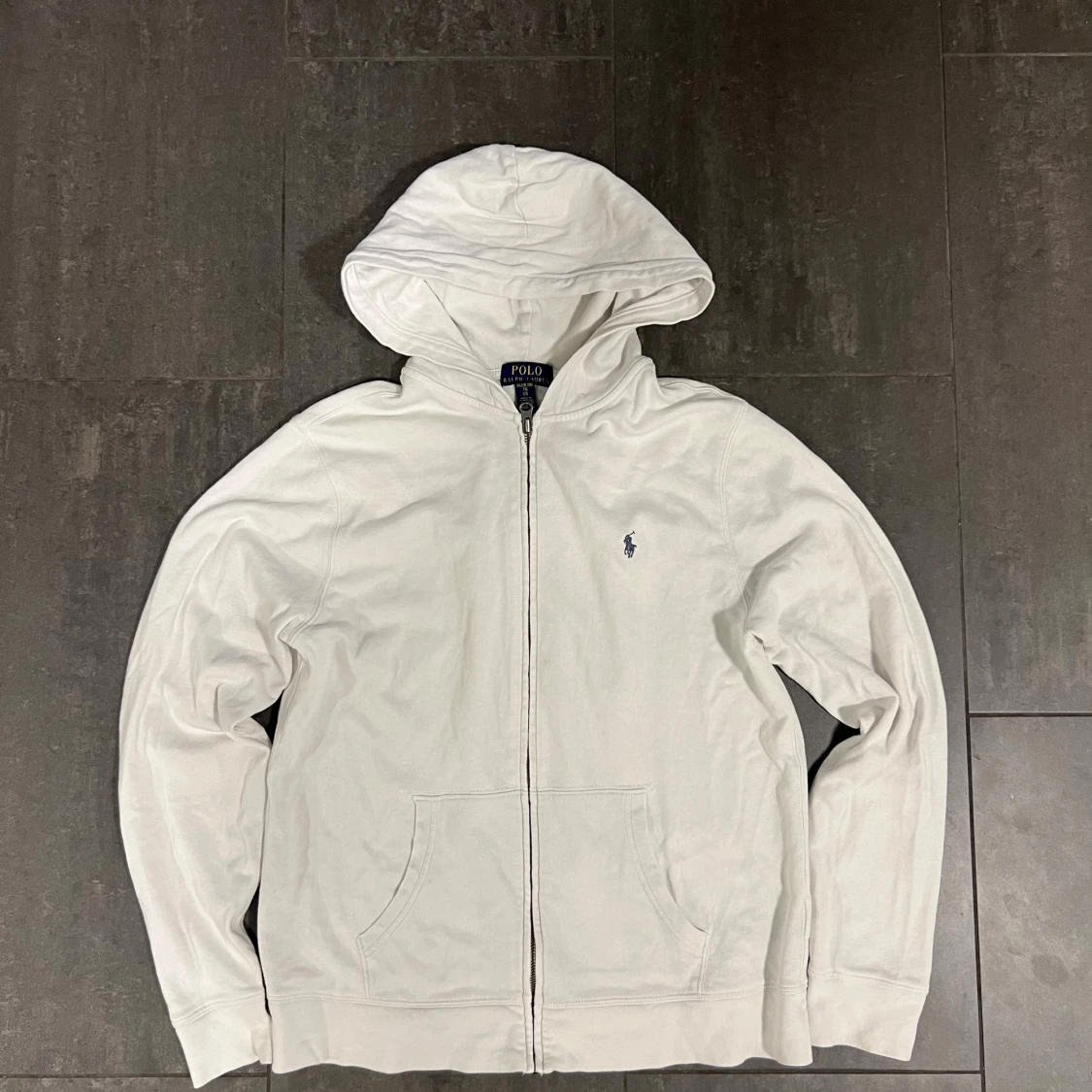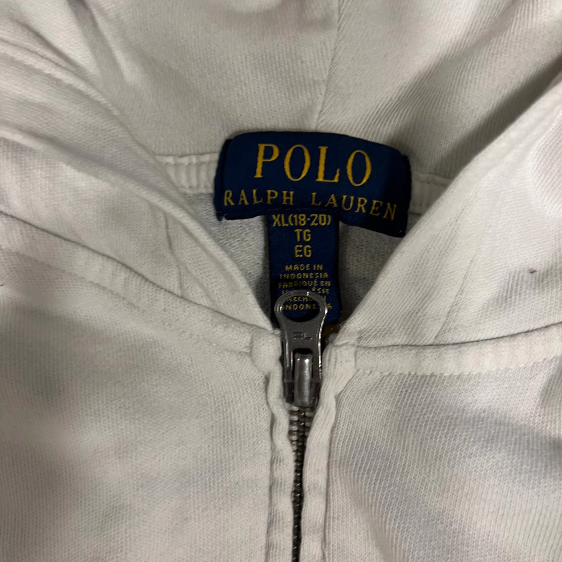 Vit hoodie från Polo Ralph Lauren i storlek XL. Klassisk design med dragkedja, huva och känguruficka. Broderad blå logga på bröstet. Tillverkad i mjuk bomull, perfekt för en chill och stilren look. Storlek barn xl sitter som S/M. Tveka inte att höra av er vid frågor och funderingar och kolla gärna in mina andra annonser så kan vi säkert fixa ett bra paketpris🤩🤩🤩