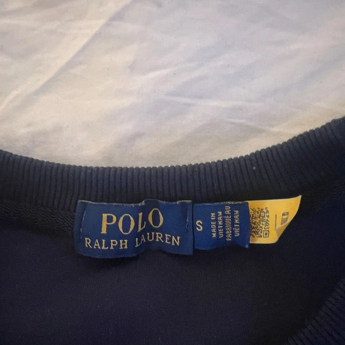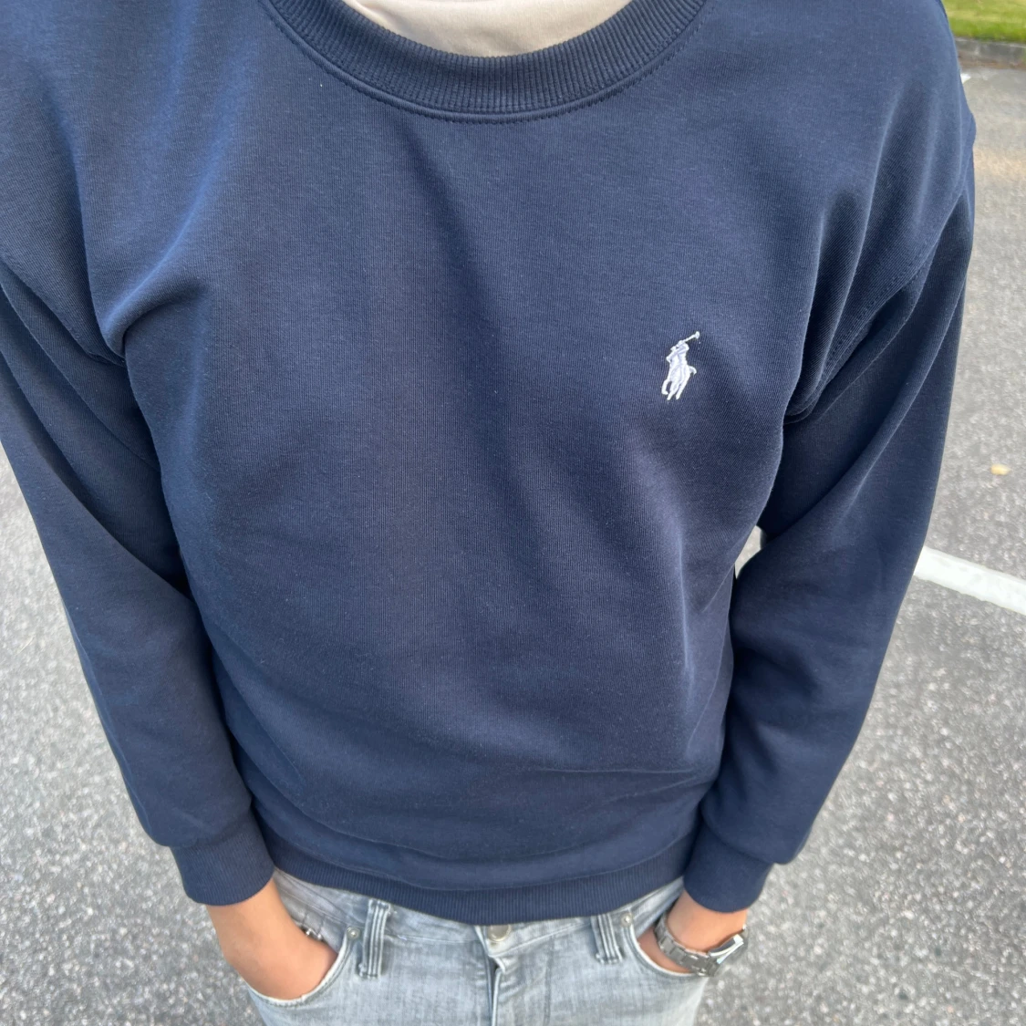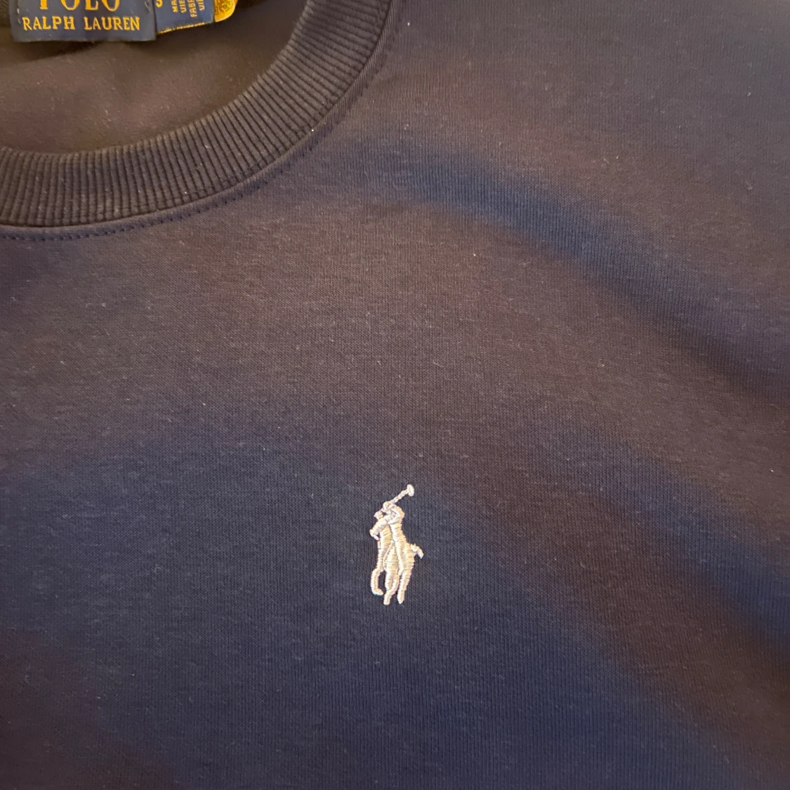 Klassisk mörkblå sweatshirt från Polo Ralph Lauren med rund halsringning och broderad vit logga på bröstet. Tröjan har ribbade muddar vid ärmslut och nederkant. Perfekt för en clean och stilren look. Tröjan är använd en gång bara. Nypris 899kr, storlek S. Priset kan diskuteras vid snabb affär.