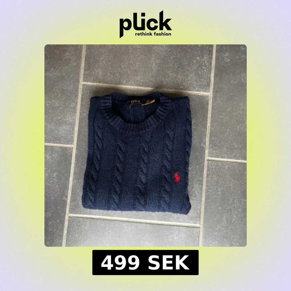 Snygg marinblå kabelstickad tröja från Polo Ralph Lauren med klassisk röd logobrodyr på bröstet. Rund hals och ribbade muddar vid ärmslut och nederkant. Perfekt för dig som gillar stilrena och tidlösa plagg.