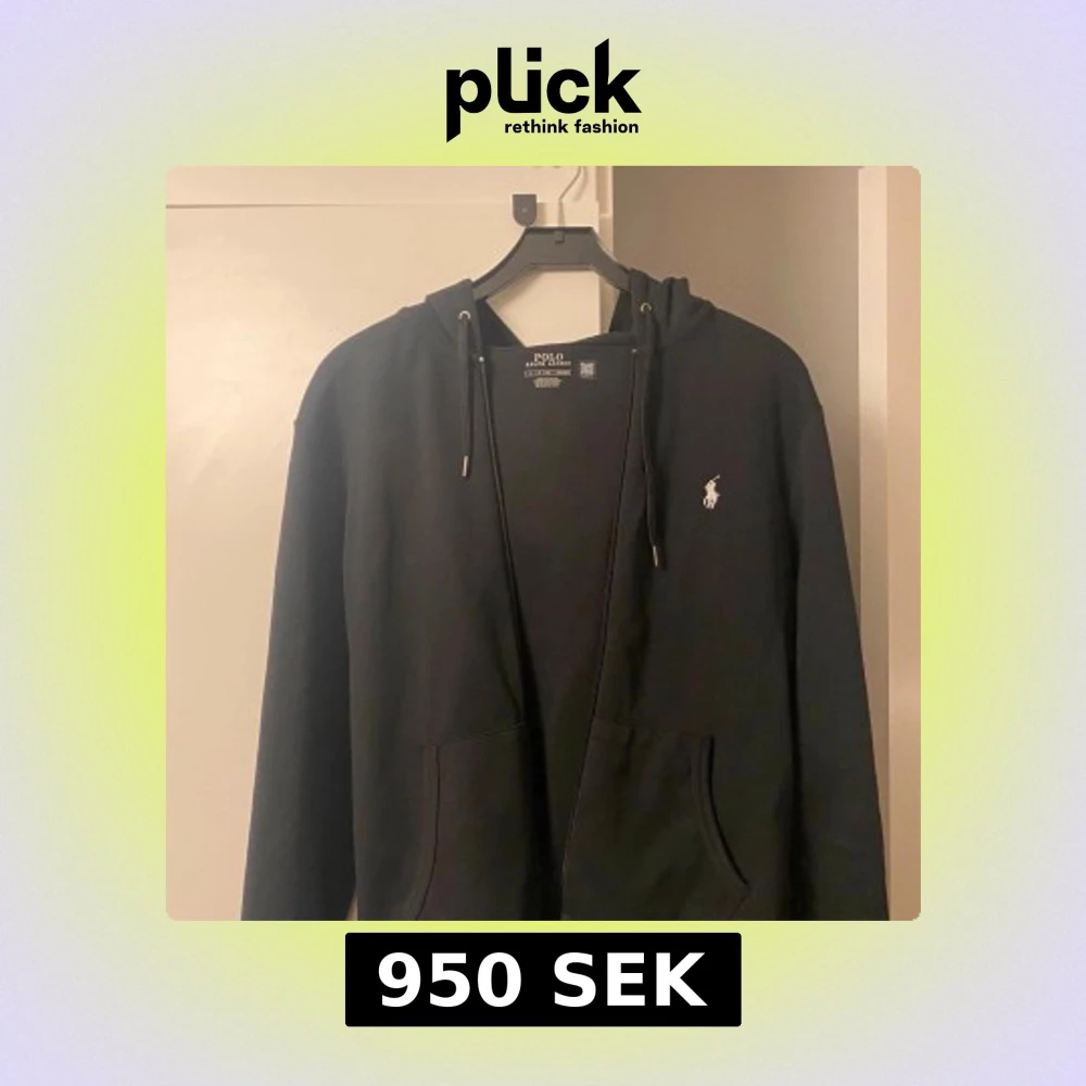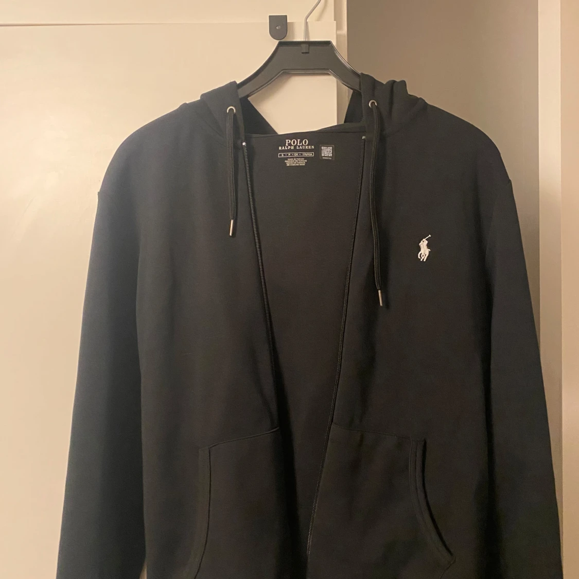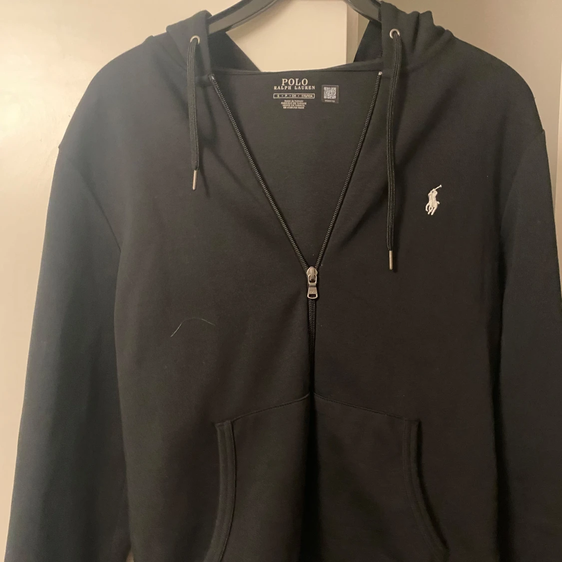 Säljer en stilren svart hoodie från Ralph Lauren med dragkedja och justerbar huva. Den har en broderad logotyp på bröstet och praktiska fickor framtill. Perfekt för en avslappnad look.