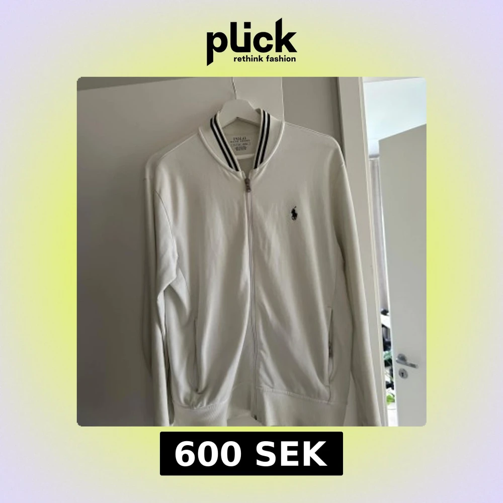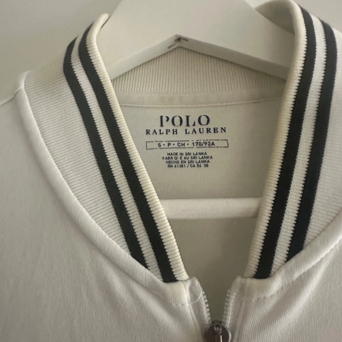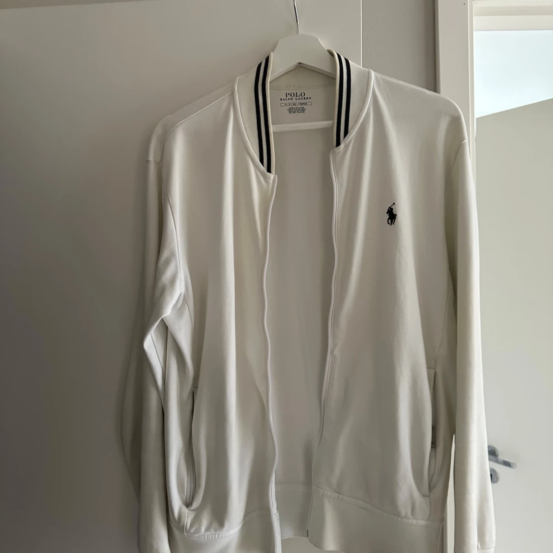 Vit kofta med dragkedja från Ralph Lauren med svart logga på bröstet och svarta ränder på kragen. Dragkedja framtill och två fickor. Skön bomullskvalitet och långärmad modell. Bra skick. Anledning till försäljning är att den är för liten för mig