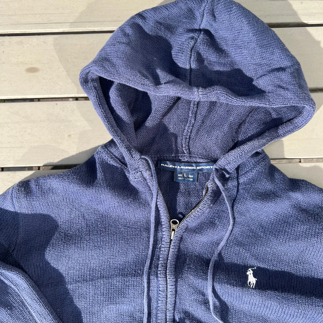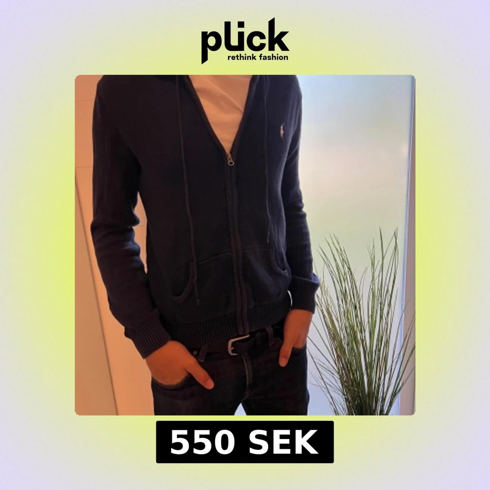 Säljer en mörkblå stickad hoodie från Ralph Lauren med dragkedja och huva. Tröjan har snörning vid huvan, ribbade muddar och två fickor framtill. Klassisk logga broderad på bröstet. Perfekt för dig som gillar en chill och stilren look.