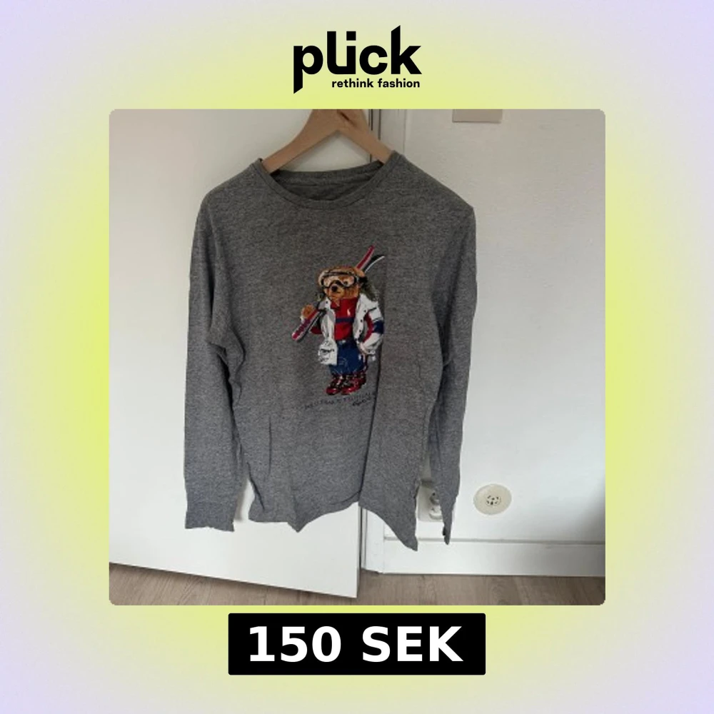 Säljer en grå långärmad tröja från Polo Ralph Lauren med ett stort tryck av deras ikoniska björn på framsidan. Tröjan har rund halsringning och är i mjuk bomull. Perfekt för en avslappnad och stilren look.