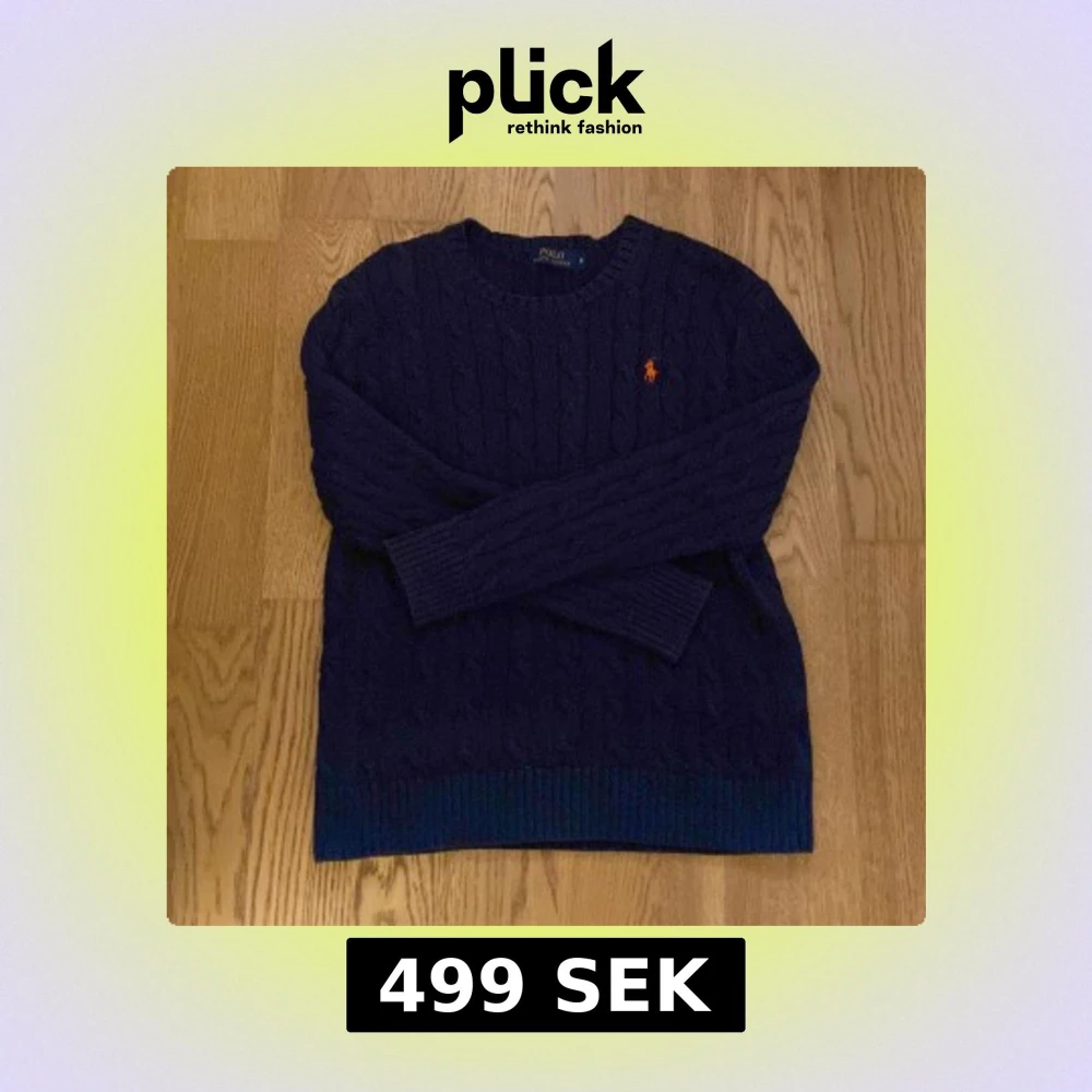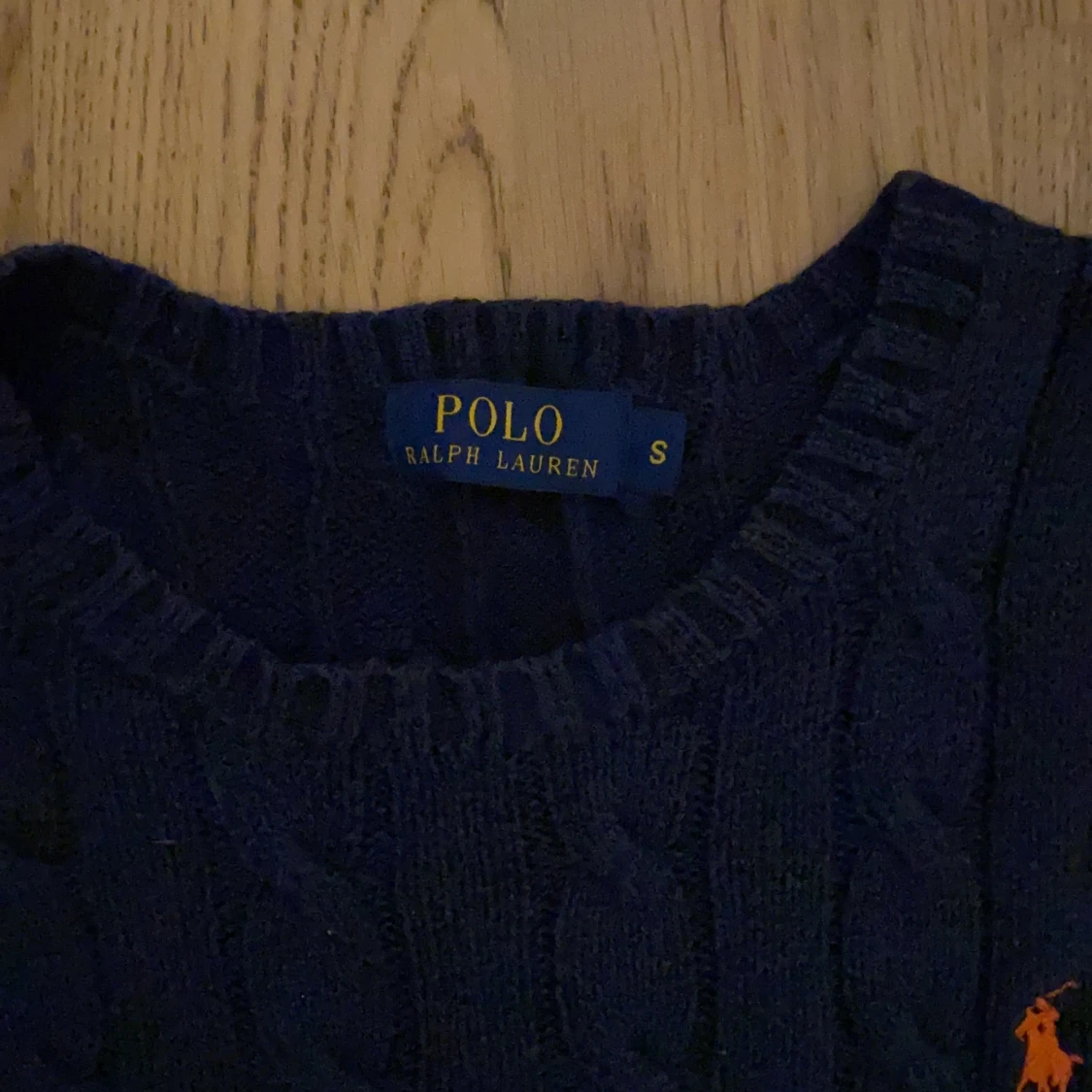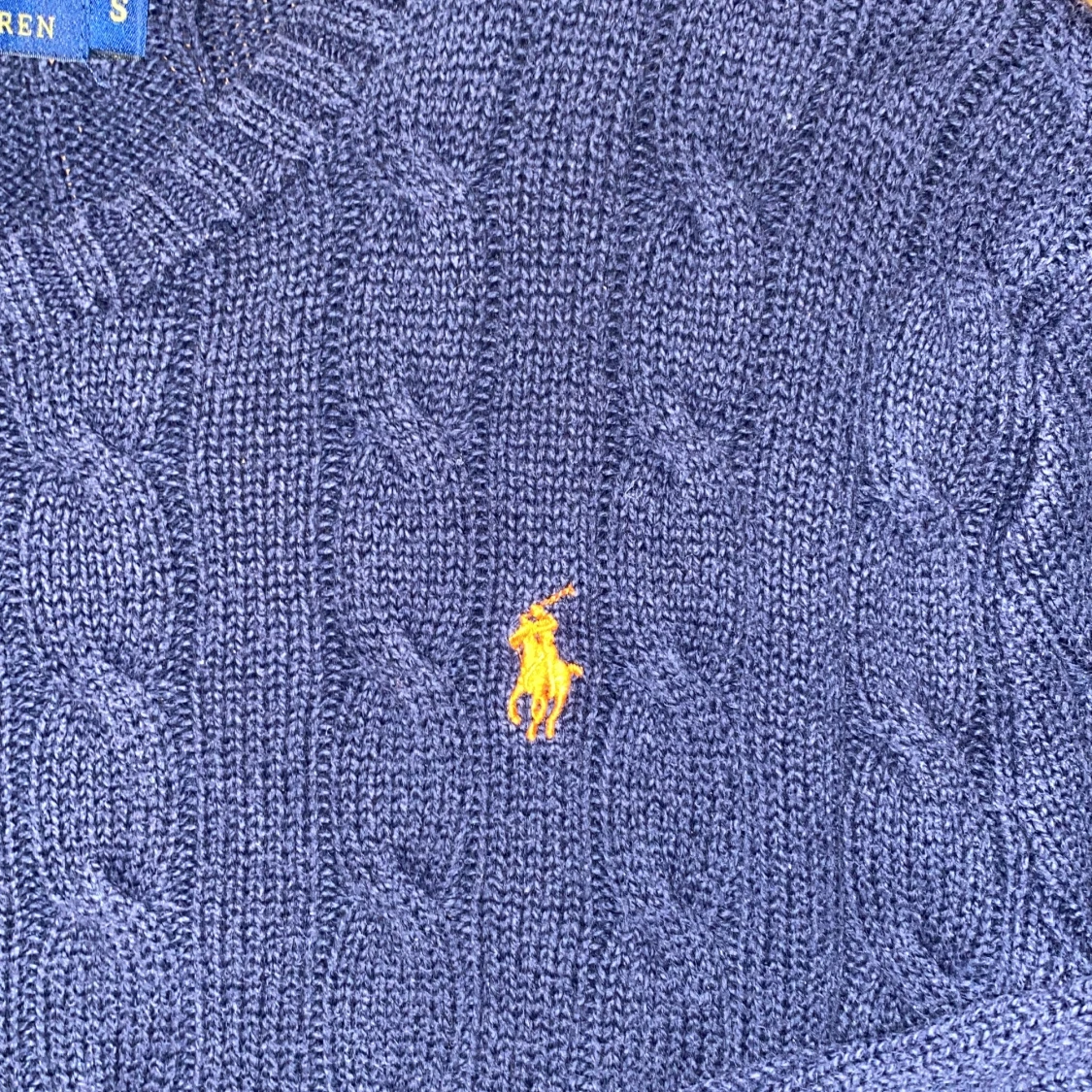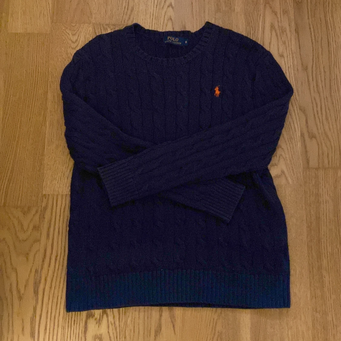 Kanoot använd Kabelstickad marinblå tröja från Polo Ralph Lauren med klassisk rund halsringning och broderad orange logga på bröstet. Tröjan är långärmad och har ribbade muddar vid ärmslut och nederkant. Perfekt för dig som gillar klassisk stil