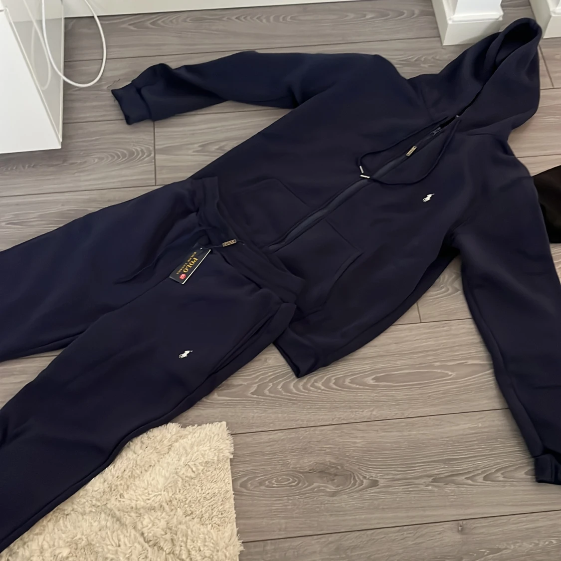 Säljer en stilren marinblå hoodie från Polo Ralph Lauren med dragkedja och huva. Tröjan har långa ärmar, ribbade muddar och den klassiska Polo-loggan broderad på bröstet. Perfekt för chill dagar eller när du vill vara extra bekväm. HELA SÄTTET 700 KRONOR