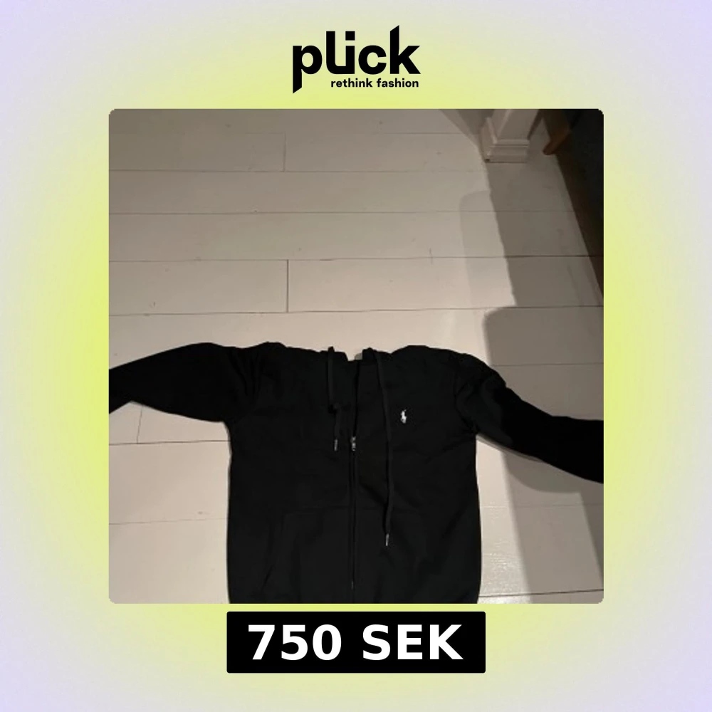Säljer en stilren svart hoodie från Ralph Lauren med dragkedja och det klassiska logotypbroderiet på bröstet. Perfekt för en avslappnad look. Den har långa ärmar och en praktisk huva med dragsko.