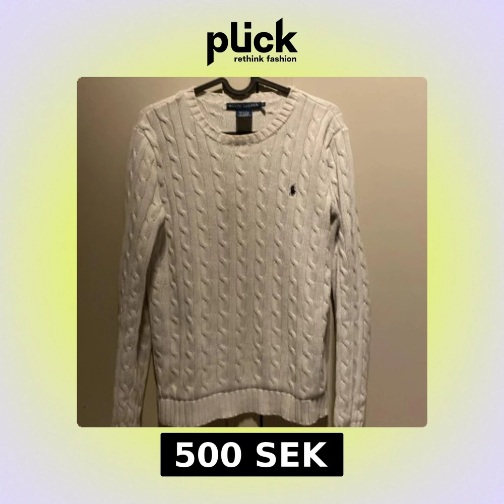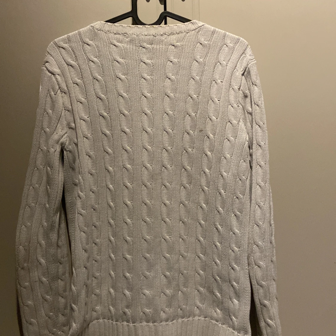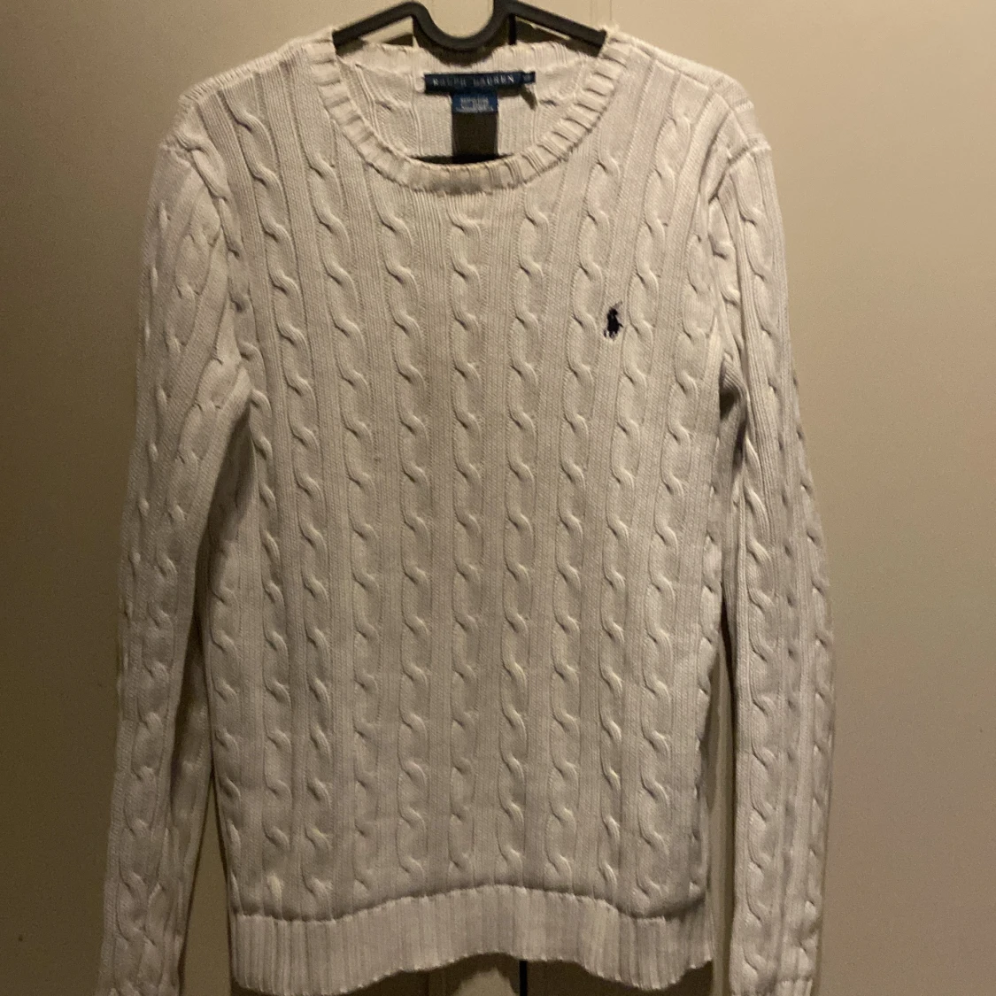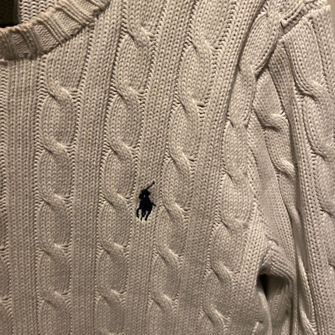 Vit kabelstickad tröja från Ralph Lauren med klassisk rund halsringning och broderad marinblå logga på bröstet. Tröjan är långärmad och har ribbade muddar vid ärmslut och nederkant. Perfekt för en clean och stilren look.