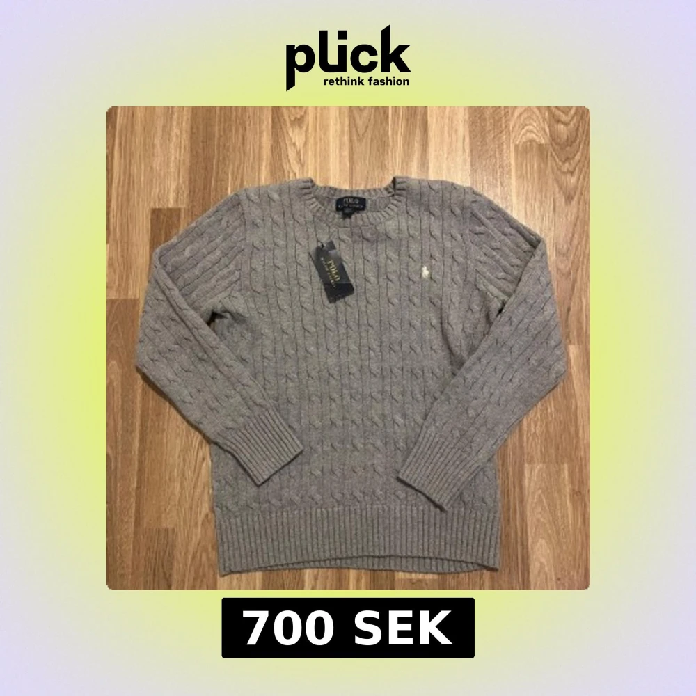 Säljer en stilren grå stickad tröja från Ralph Lauren med kabelstickat mönster. Tröjan har långa ärmar och ribbade muddar vid ärmslut och nederkant. Perfekt för kyligare dagar!
