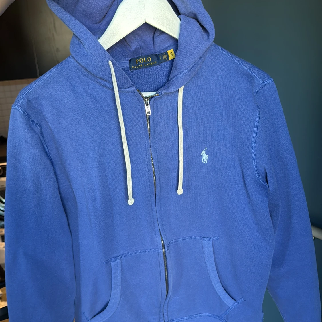 Blå hoodie från Polo Ralph Lauren med vit broderad logga på bröstet. Tröjan har huva med vita snören, dragkedja framtill och två fickor. Tillverkad i mjuk bomull, perfekt för chill dagar.