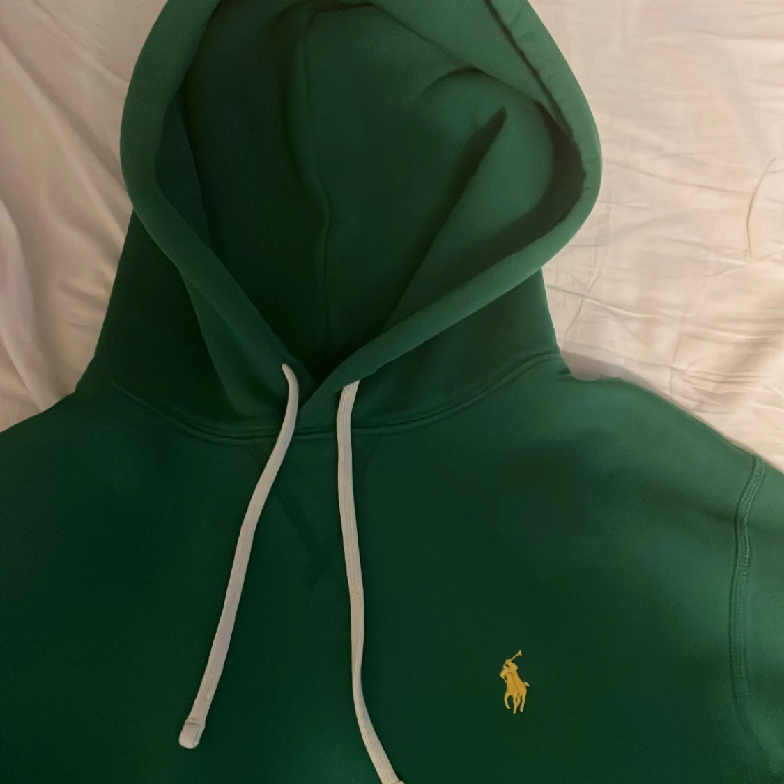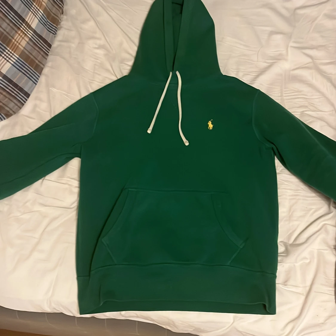 Snygg grön hoodie från Polo Ralph Lauren med klassisk gul broderad logga på bröstet. Tröjan har huva med vita snören och en stor magficka framtill. Perfekt för dig som gillar stilrena och sportiga plagg med premiumkänsla.