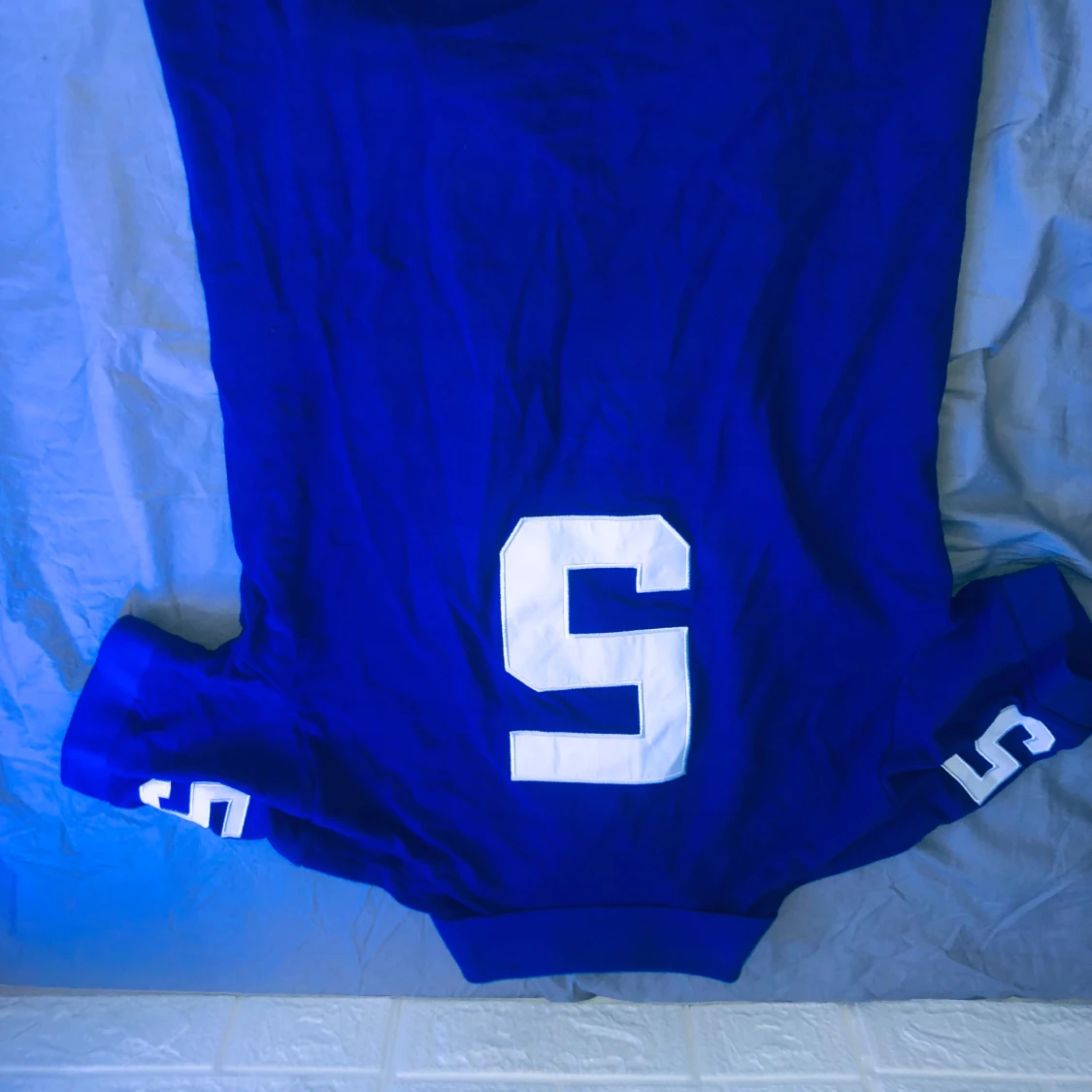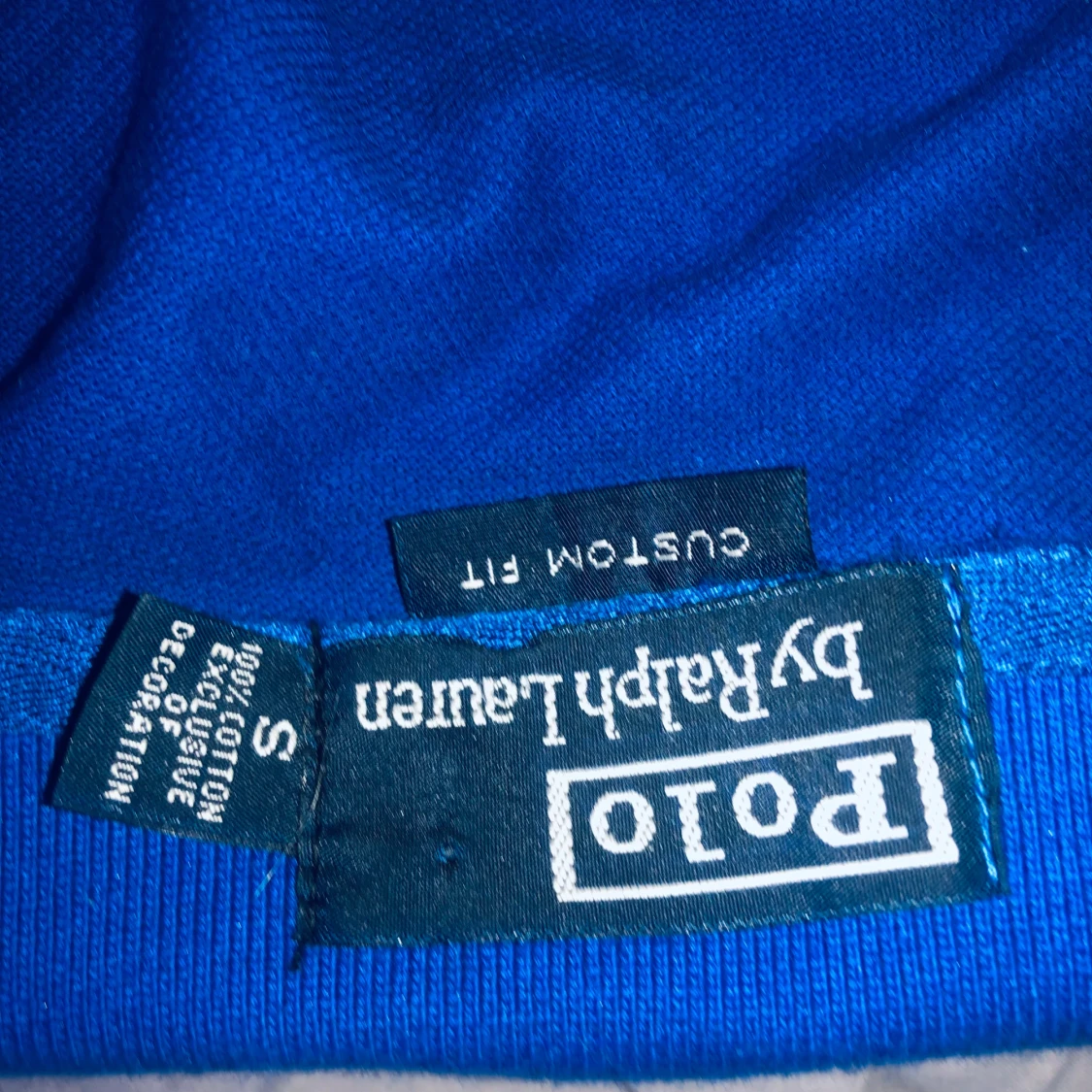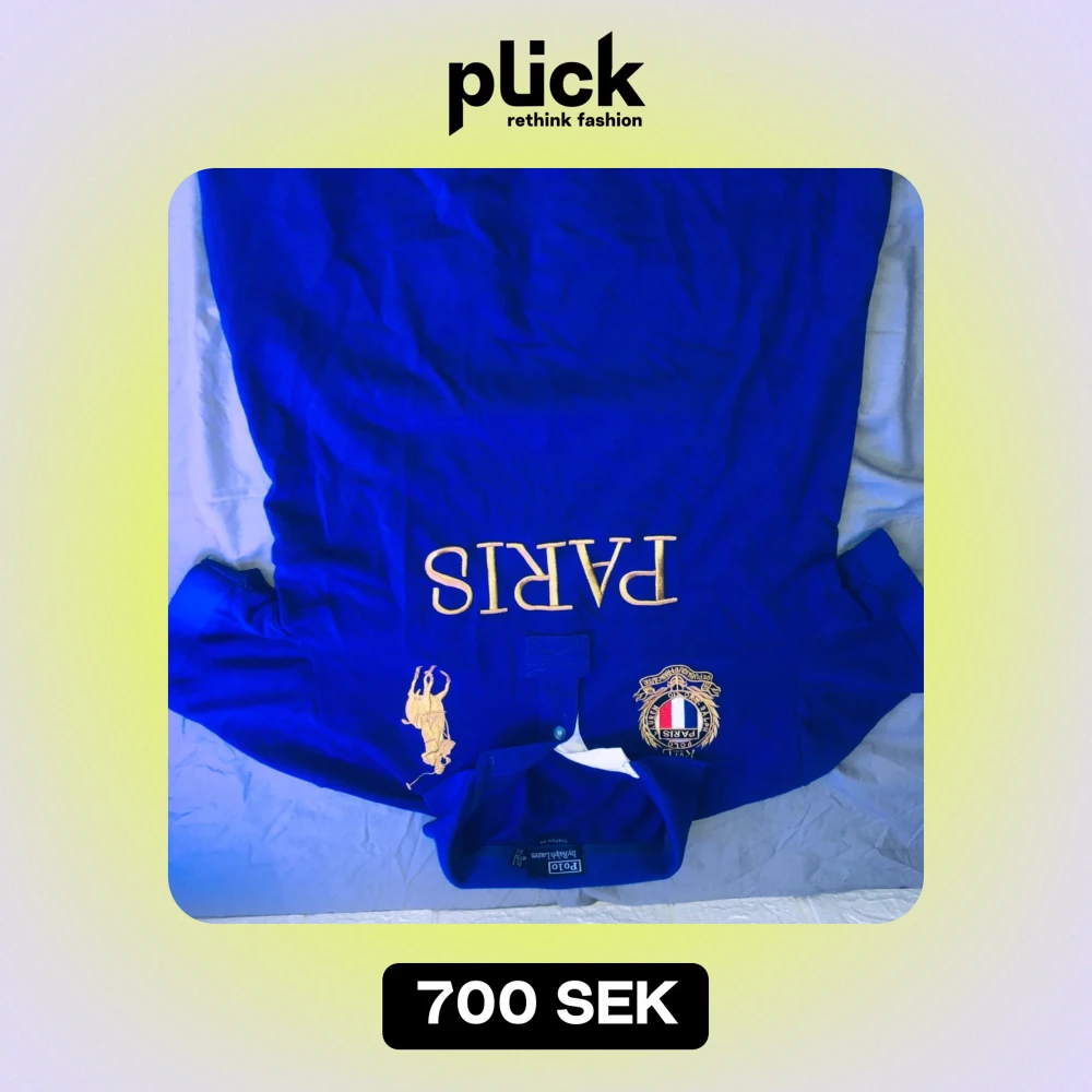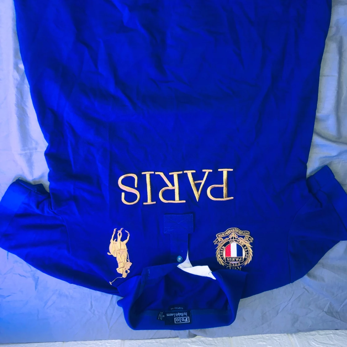 Säljer en snygg blå pikétröja från Ralph Lauren med texten 'PARIS' i guld på framsidan och en stor vit siffra '5' på baksidan. Tröjan har korta ärmar och en klassisk krage. Perfekt för en stilren och sportig look!