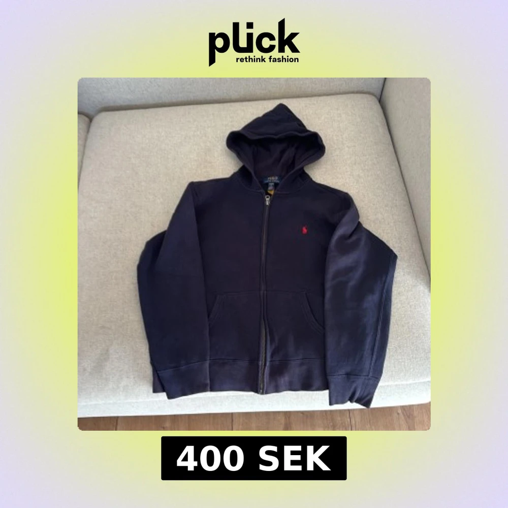 Snygg mörkblå hoodie från Polo Ralph Lauren med klassisk röd broderad logga på bröstet. Tröjan har huva, dragkedja framtill och två praktiska fickor. Tillverkad i mjuk bomullsmix. Den är lite blekt. Passar dig som är runt 1,65