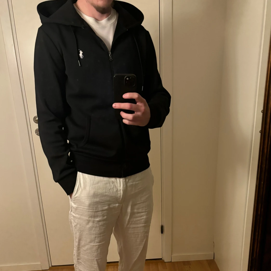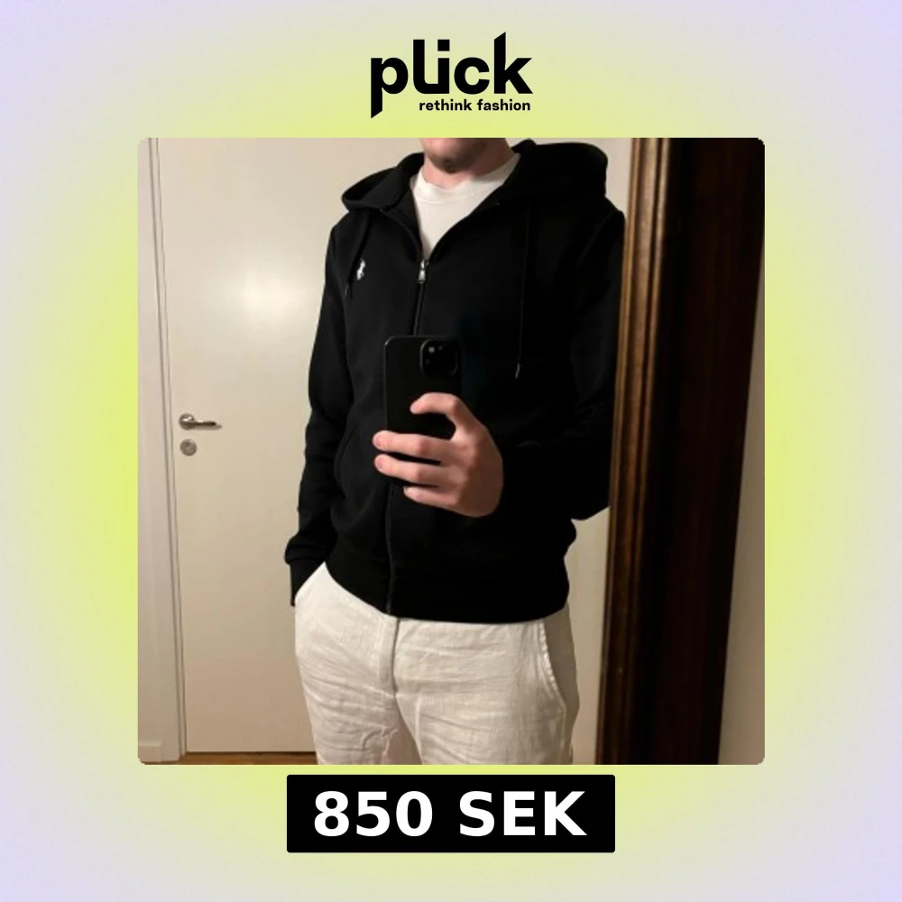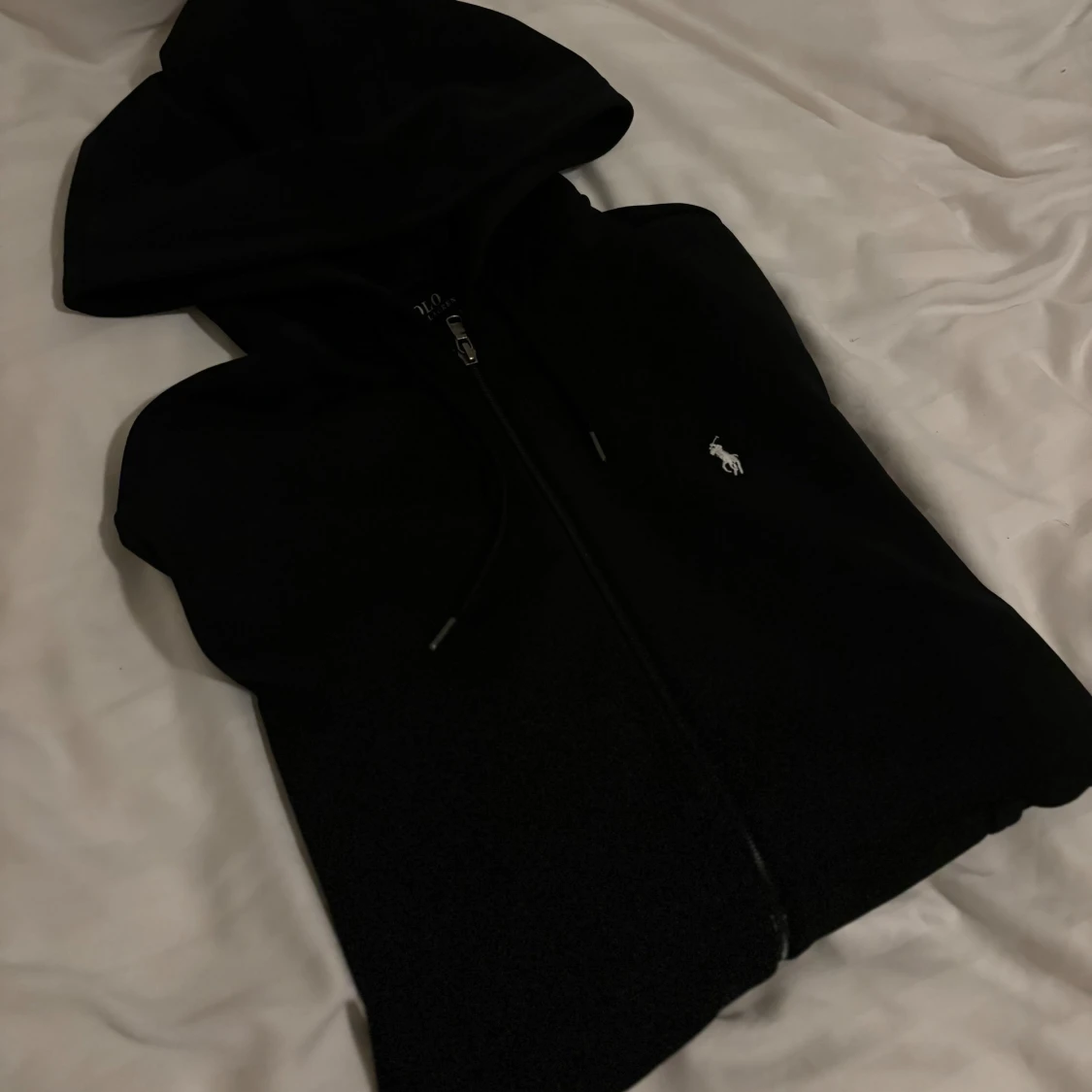 Svart Ralph Lauren zip hoodie som är nästan som ny då den knappt är använd och är därför i mycket bra skick! Storleken är S, men skulle nästan säga att den passar M med, personen på bilden är 182