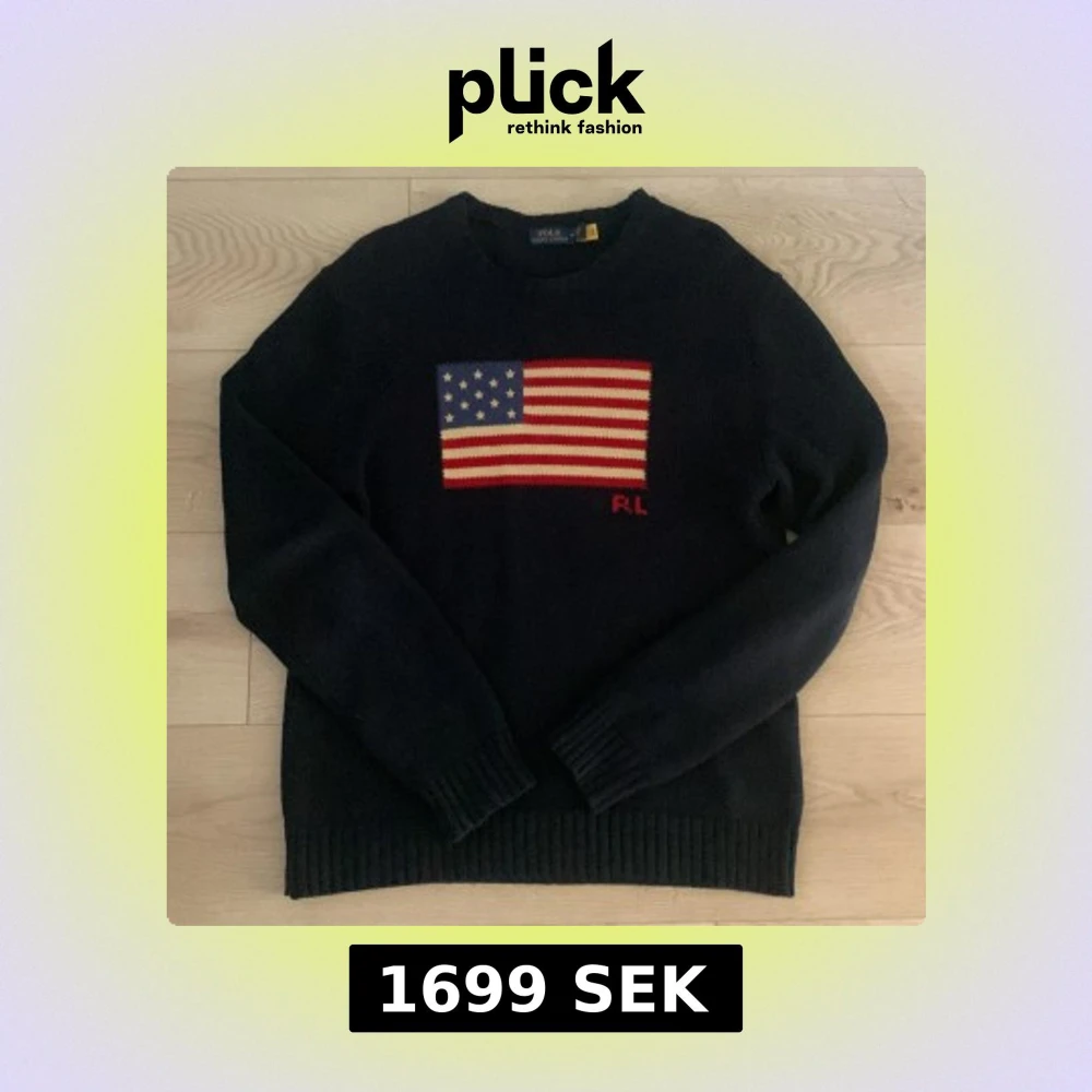 Säljer en mörkblå stickad tröja från Polo Ralph Lauren med en amerikansk flagga på framsidan. Tröjan har långa ärmar och ribbade muddar vid ärmslut och nederkant. Perfekt för en stilren och klassisk look.