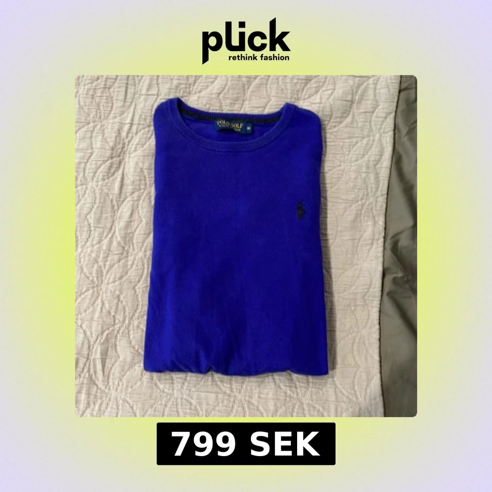 Snygg blå stickad tröja från Polo Golf Ralph Lauren i storlek M. Tröjan har rund hals, långa ärmar och en diskret svart logga broderad på bröstet. Perfekt för dig som gillar klassisk stil med en modern touch. Den är lite lila blå aktig en riktigt snygg och lite annorlunda färg som får dig att sticka ut från andra!