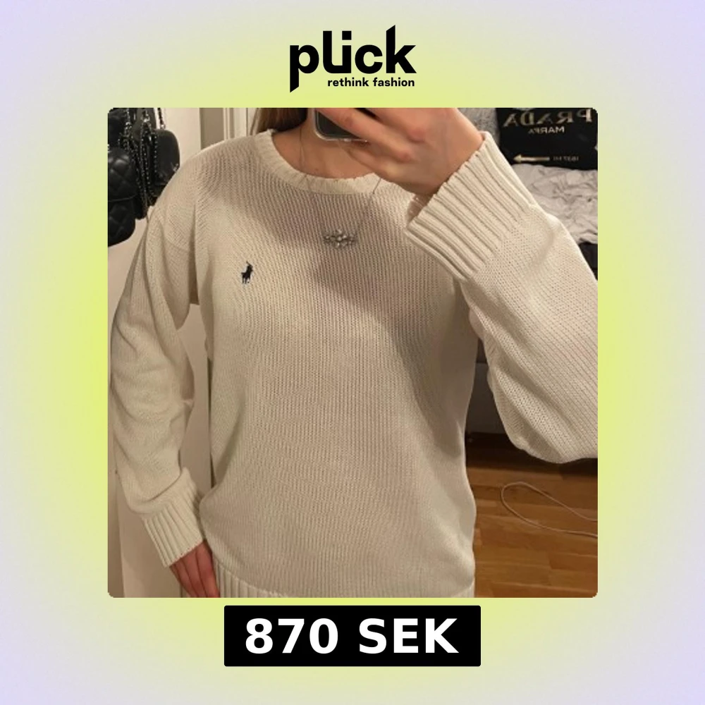 Vit stickad tröja från Ralph Lauren med marinblå logga broderad på bröstet. Passar storlek XS-L, bror på hur man vill den ska sitta!