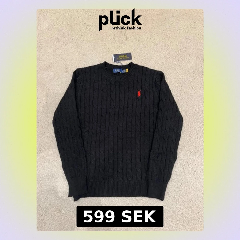 Svart stickad tröja från Polo Ralph Lauren med klassiskt kabelmönster och röd broderad logga på bröstet. Rund halsringning och långa ärmar. Perfekt för dig som gillar stilrena och tidlösa plagg med en touch av lyx.
