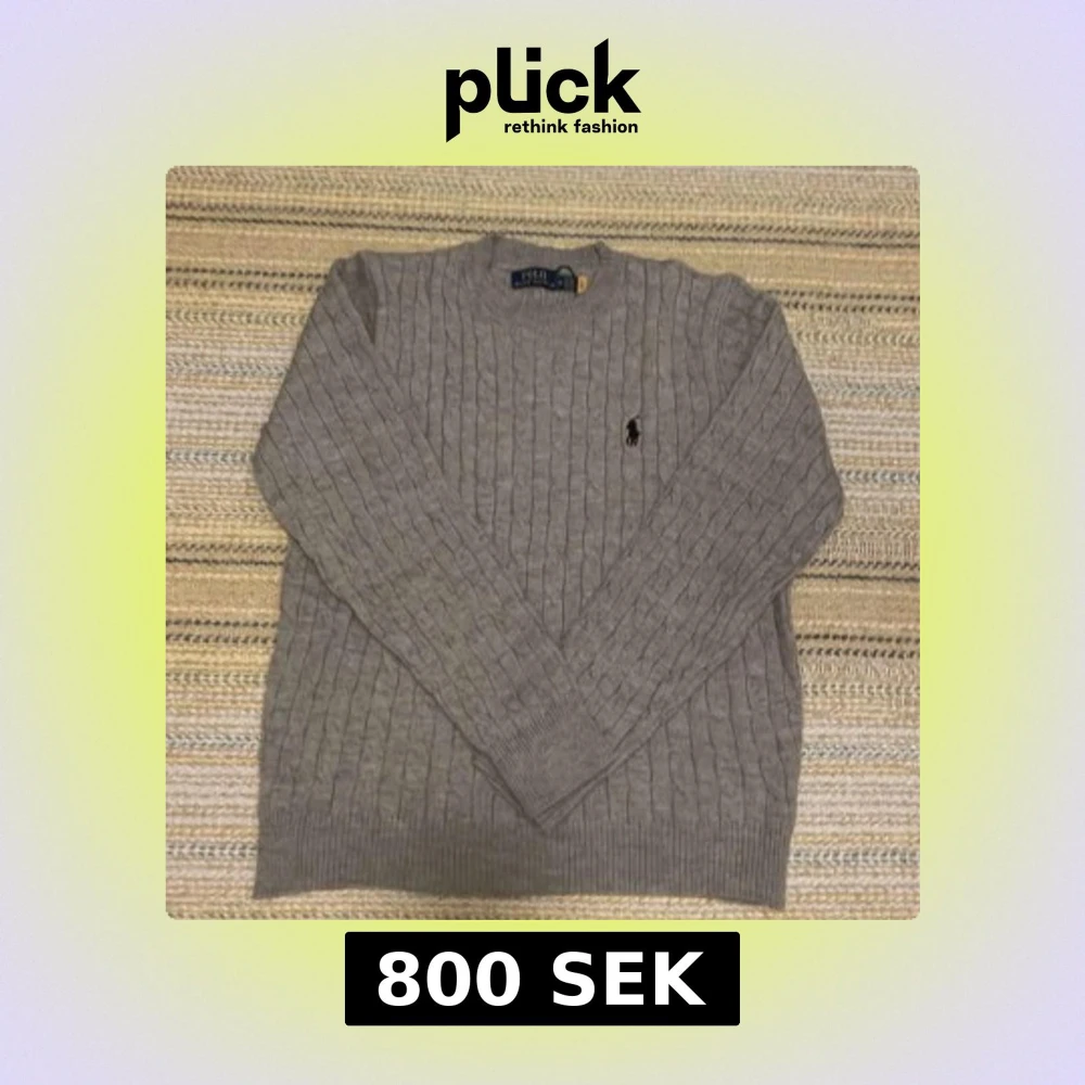 Säljer en klassisk grå kabelstickad tröja från Polo Ralph Lauren med broderad logga på bröstet. Tröjan har rund halsringning och långa ärmar, perfekt för lager-på-lager under kyligare dagar.
